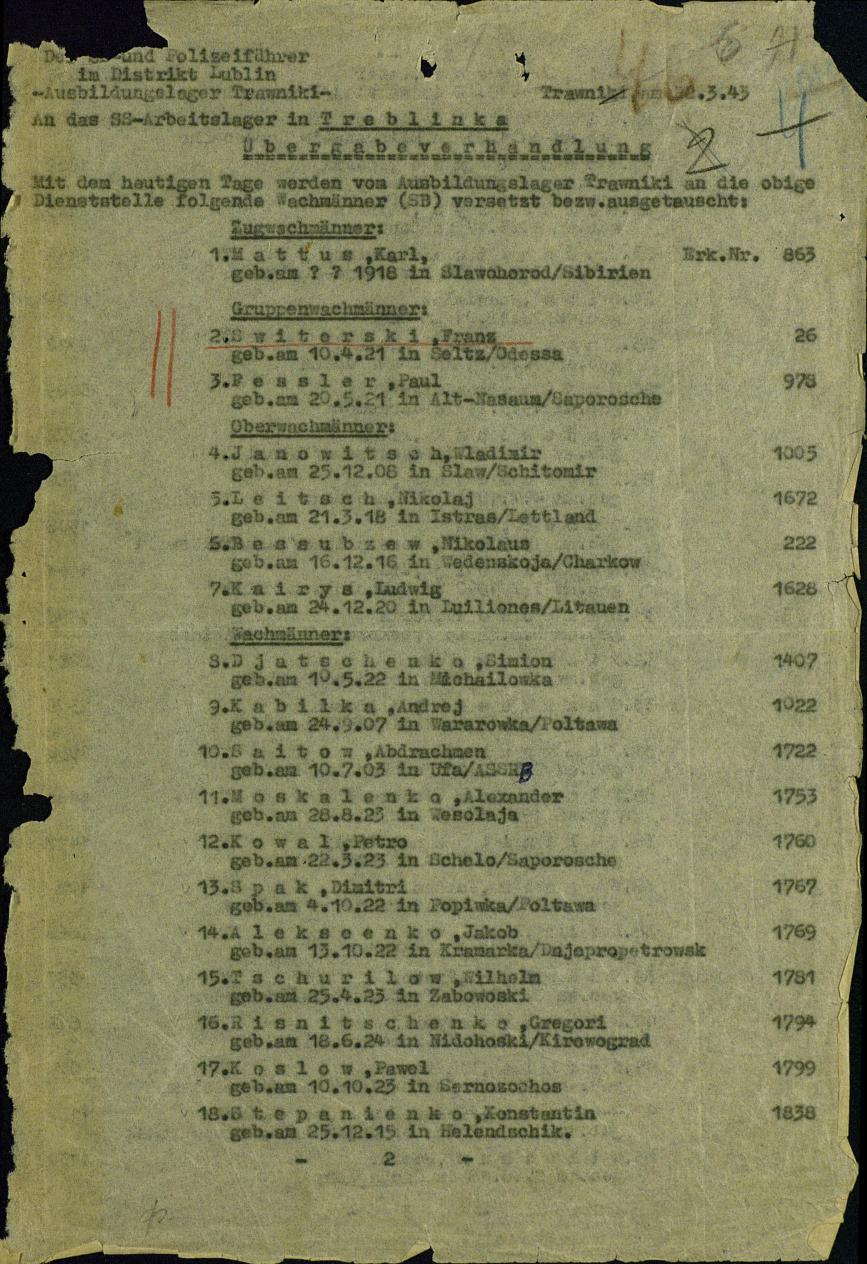 Например, акт от 2 марта 1943 г. о переводе 40 вахманов из учебного лагеря Травники в команду СС Люблина; акт от 27 марта 1943 г. о направлении 75 вахманов-травниковцев в лагерь смерти Белжец, акт от 17 апреля о переводе 350 вахманов-травниковцев в Варшаву.[33] (Последние примут участие в подавлении восстания в Варшавском гетто в апреле-мае 1943 г.) Документ от 19 мая 1943 г. переводе 17 мая 1943 г. 75 вахманов СС из Люблина в Лемберг (Львов); документ о переводе 17 вахманов из Люблина в Лемберг; акт от 16 сентября 1943 г. о переводе 100 вахманов из Люблина в лагерь смерти Собибор; акт от 1 октября 1943 г. о переводе 140 вахманов из Травники на охрану в концлагерь Флоссенбюрг; акт от 9 ноября 1943 г. о переводе 200 вахманов из Травники в распоряжение командира караульного батальона СС лагеря Заксенхаузен. Имеется акт от 20 ноября 1943 г. о переводе 43 вахманов СС из учебного лагеря Травники в Ораниенбург.[34] В деле имелись копии списков личного состава лагеря периода 1943 г.[35]