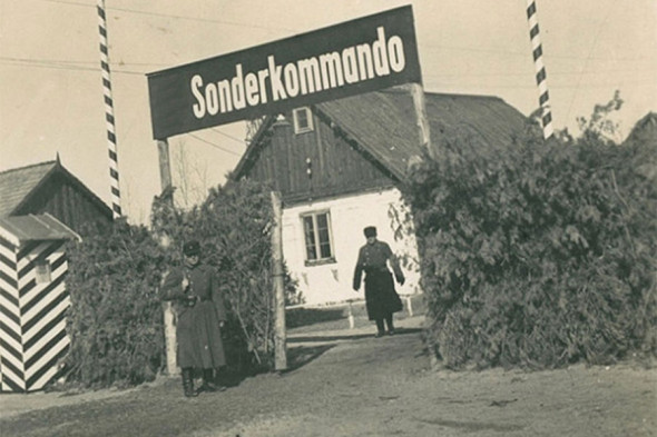 На фотографии, сделанной в начале лета 1943 года с одной из караульных вышек, можно увидеть дома персонала лагеря и бараки заключенных, окруженные двойной оградой