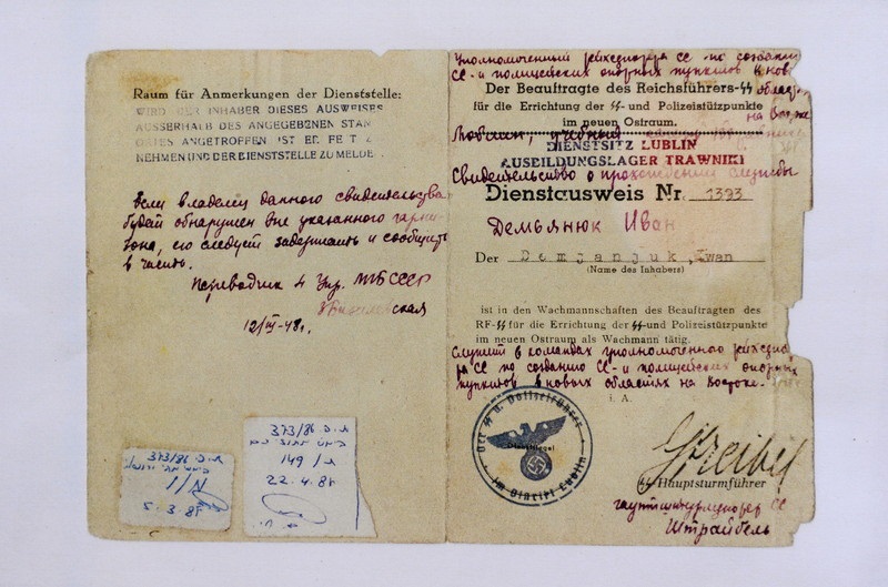 | Травник Иван Демьянюк. Его удостоверение № 1393. Соответствует ли номер этого удостоверения его регистрационному номеру в учебном лагере Травники - не уверен. Скорее нет. Из удостоверения видно, что с 27 марта 1943 года он был в КЛ Собибор, до этого с 22 сентября 1942 года в поместье Окцов, где охранял евреев на сельхозработах.