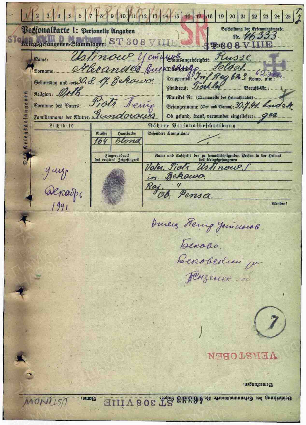 Здравствуйте! Много лет ищу брата своей бабушки, он пропал без вести осенью 1941 г. Никакой информации о нем нет ни на сайте "Память народа", и на "Мемориале". Его звали Устинов Александр Алексеевич, 1908 г.р. Нашла информацию о том, что некий Устинов Александр погиб в Мариборе 10.11.1941 г. В/п № 46333. Упоминание только в списке военнопленных, нет ни карточки, ничего больше. Означает ли это, что карточка военнопленного не сохранилась? Возможно ли, что есть какая-то информация, с помощью которой можно было бы идентифицировать личность человека?