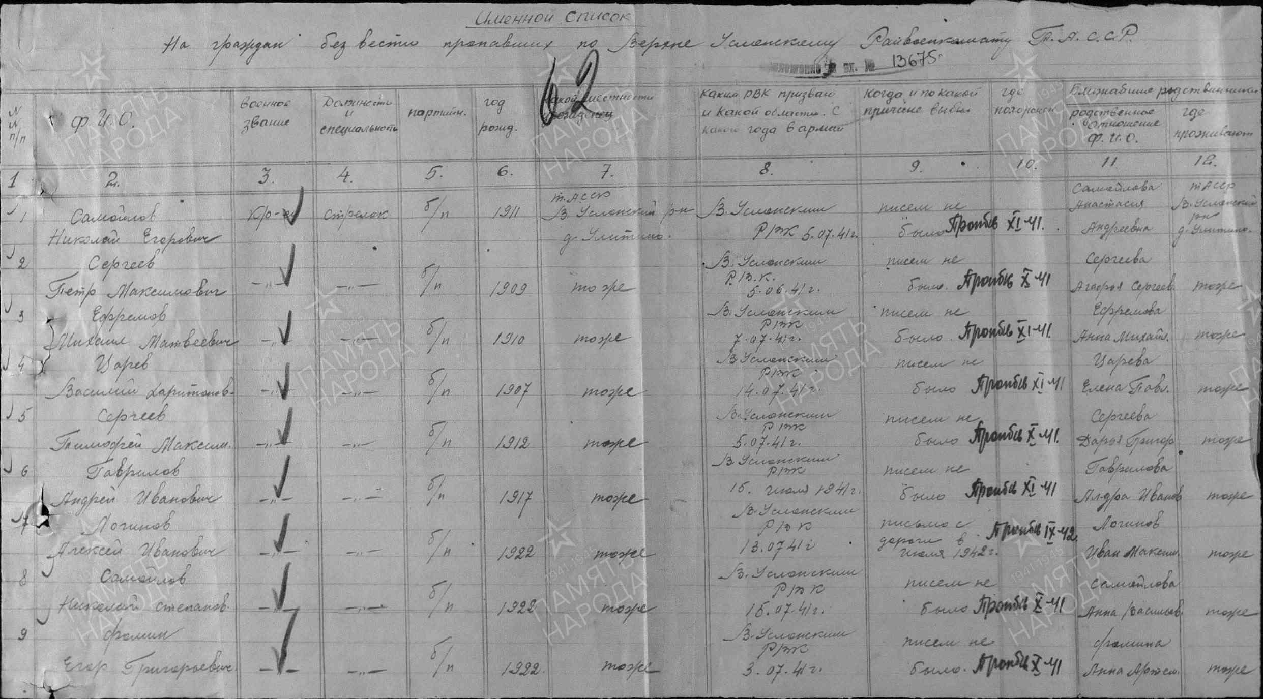 Здравствуйте! Ещё один прадедушка пропал без вести и дальнейшая судьба его неизвестна. Вполне может быть, что он с моим другим прадедушкой (Сергеев Тимофей Максимович, 1912 г.р.) были вместе в бою и пропали тоже где то в одной области. Они из одной деревни (Улитино, Татарстан) и даты призыва у них схожие, и пропали с разницей в месяц.