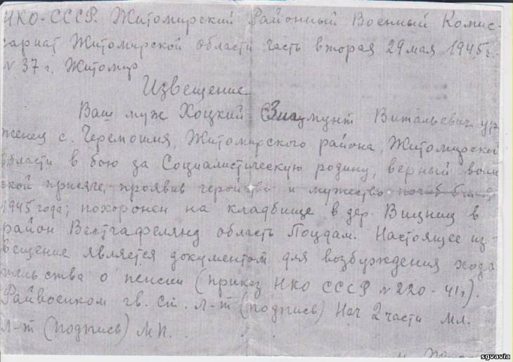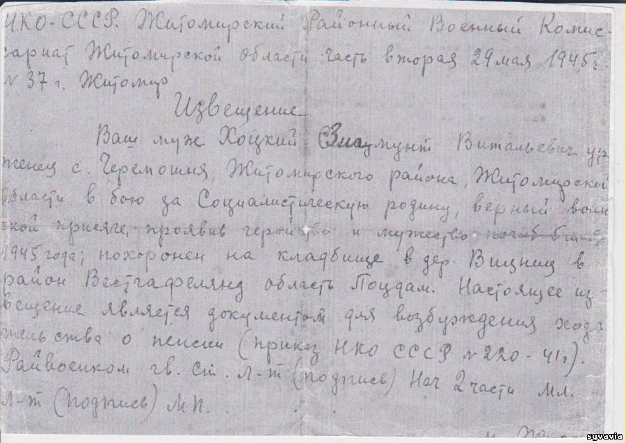 добрый вечер, прошу помочь найти могилу прадеда Хоцкого Зигмунда (Сигизмунд, Зигмунт) Витальевича 1909 г.р. Согласно извещения прадед погиб 05 мая 1945 года, похоронен на кладбище в дер.Вицниц в районе Вестгафелянд, Потсдам.