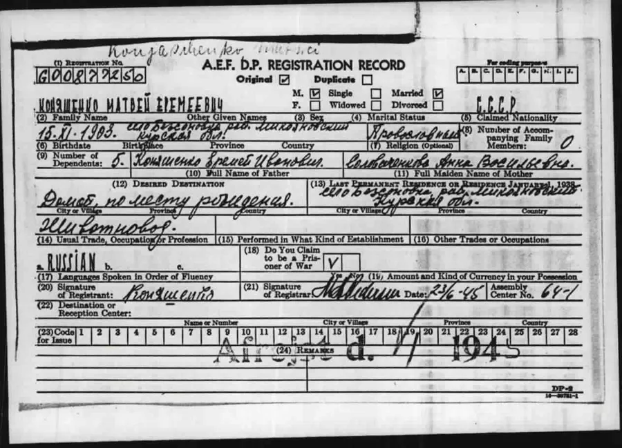 Документ заполнен 23.06.1945, Коняшенко отправлен в СССР