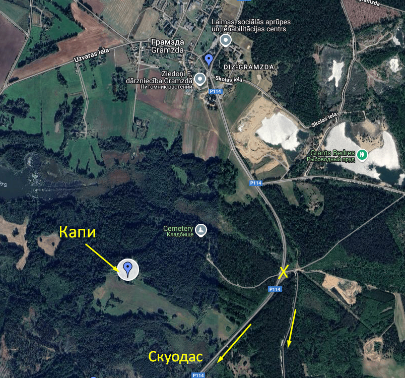 Саня, «ты конечно вор авторитетный» (Джентельмены удачи), но причём тут Приекуле к Грамздской волости и тем более, что первичное место захоронения возможно было в другой республике СССР, а теперь другой стране. Дорогу, о которой идёт речь в донесении я нарисовал, она в Литве, а не в Латвии. Нужна карта. У меня не выйдет ее открыть на Память Народа.