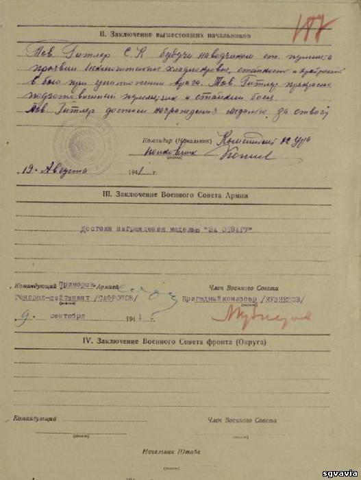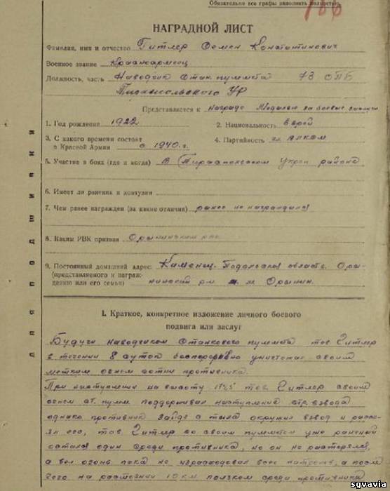 Семьдесять лет назад при обороне высоты 174,5 Тираспольского укреп. района Семен Константинович огнем пулемета уничтожил более сотни военнослужащих Вермахта. Израсходовав боезапас, получив ранение и оказавшись впоследствии в окружении, красноармеец не бросив оружия, преодолев более 10 километров, вышел к своим. Что и подтверждается наградным листом от 19 августа 1941 года. Подвиг красноармейца Гитлера тянул по статуту на «Красную звезду», но вытянул только на «Отвагу». Фамилия помешала? Хотя в начале войны награждали с большим скрипом и «За Отвагу!» 41-ого года стоит ордена редакции 45-ого.