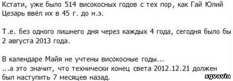 Добавим, что календарь цивилизации майя в Месоамерике, расцвет которой приходится на I тысячелетие нашей эры, охватывает 5 тысяч 125 лет. Он рассчитан до 21 декабря 2012 года. Некоторые люди полагают, что после этого, согласно верованиям индейцев, наступает конец света. Другие же склонны думать, что майя просто поленились составлять календарь на более продолжительное время.