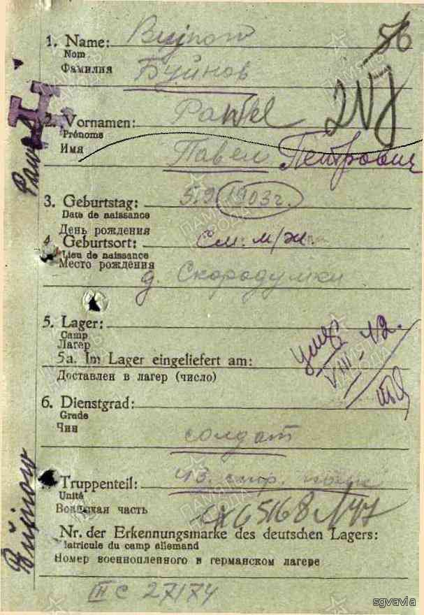 Добрый день! Хотела бы тоже попросить о помощи в переводе и расшифровке карточки военнопленного, моего прадеда. Раньше считали деда погибшим в Крыму, но этой весной я озадачилась поиском информации о нем, о месте захоронения и обнаружила записи о том , что был в плену. И карточку пленного с фото (в семье не сохранилось ни одного, возможно и не было) Его дочь (моя бабушка) этой осенью умерла в 89 лет, так и не узнав, что ее отец был в плену ,наверно это и к лучшему.. Хочу сохранитькак можно больше памяти о нем, и передать родственникам и детям. Нашла много информации о боевом пути. Военные документы о боях в те дни когда был пленен (8 мая 42 в Керчи) по часам. Нашла фильм из немецких хроник в этих местах в это время. Вот хотелось бы еще полностью узнать перевод карточки пленного, интересуют любые подробности, не смогла перевести болезнь, от которой умер. И остальную информацию на этом же листе. Буду очень благодарна тем, кто откликнется.
