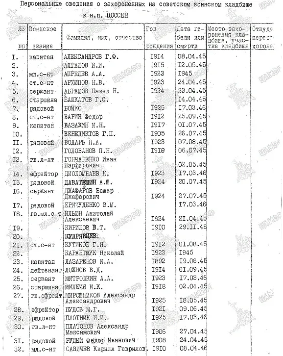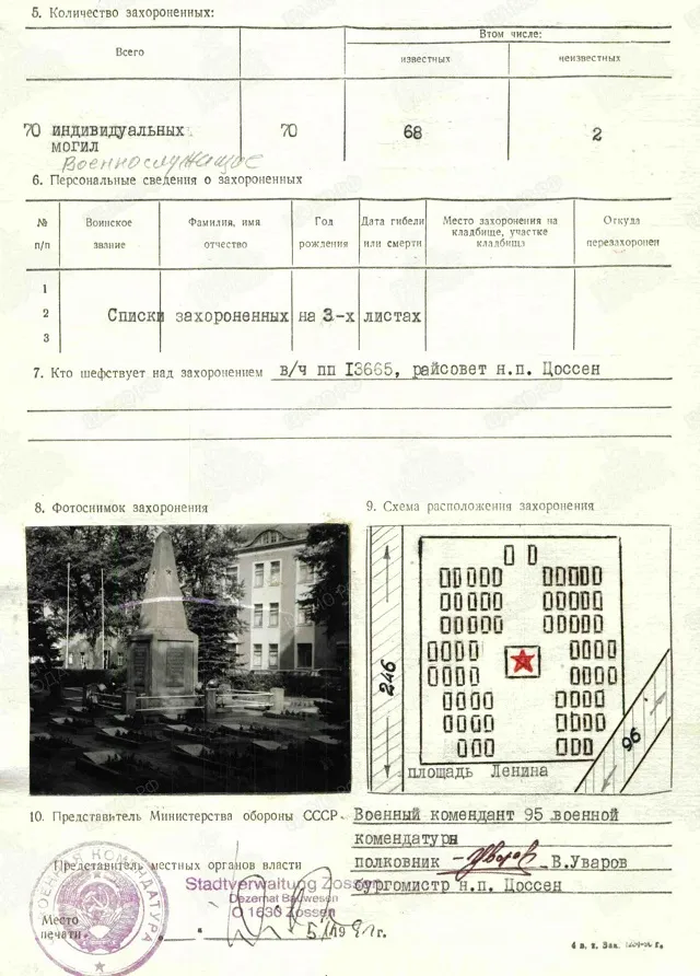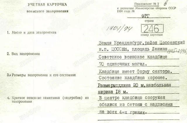 Страна захоронения ФРГ Регион захоронения Земля Бранденбург Номер захоронения в ВМЦ 1704/94 Место захоронения район Цоссенский, н.п. Цоссен, площадь Ленина. Дата создания современного места захоронения __.__.1945 Дата последнего захоронения __.__.1946 Вид захоронения советское воинское кладбище 70 одиночных могил Размеры современного места захоронения Кладбище имеет форму сектора. Размеры: длина 20 м, наибольшая ширина 18 м. Состояние захоронения хорошее Захоронено всего 70 Захоронено известных 68 Захоронено неизвестных 2 Описание памятника (надгробия) В центре кладбища сооружен обелиск из бетона с надписями на всех 4-х гранях Кто шефствует над захоронением В/ч пп 13665, райсовет н.п. Цоссен Дополнительная информация о месте захоронения Обелиск представляет собой пирамиду с четырехугольным основанием размером 2х2 м и высотой 8 м. На всех четырех гранях сделана надпись на русском языке "Вечная слава героям, павшим в боях за свободу и независимость Советской Родины. 1941-1945 гг.". На вершине со всех четырех сторон закреплена металлическая звезда. Вокруг обелиска в 9 рядов расположены индивидуальные могилы, каждая из которых представляет собой бетонный цветник размером 1х2 м. В изголовье каждого цветника находится надгробная плита из мрамора размером 60х40 см на которой выбита фамилия захороненного. https://obd-memorial.ru/html/info.htm?id=250000223&p=1