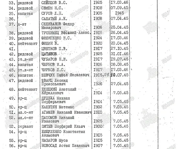 № 56 Фамилия Новосад Имя Астап Отчество Павлович Дата рождения/Возраст __.__.1907 Воинское звание красноармеец Дата смерти 07.05.1945 Страна захоронения ФРГ Регион захоронения Земля Бранденбург Место захоронения район Цоссенский, н.п. Цоссен, площадь Ленина. https://obd-memorial.ru/html/info.htm?id=250046091