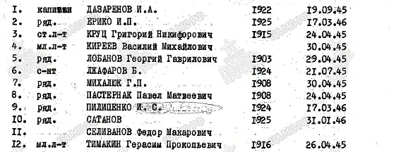 № 49 Фамилия Дудежа Имя Михаил Отчество Порфирьевич Дата рождения/Возраст __.__.1914 Воинское звание красноармеец Дата смерти 07.05.1945 Страна захоронения ФРГ Регион захоронения Земля Бранденбург Место захоронения район Цоссенский, н.п. Цоссен, площадь Ленина. https://obd-memorial.ru/html/info.htm?id=250046084