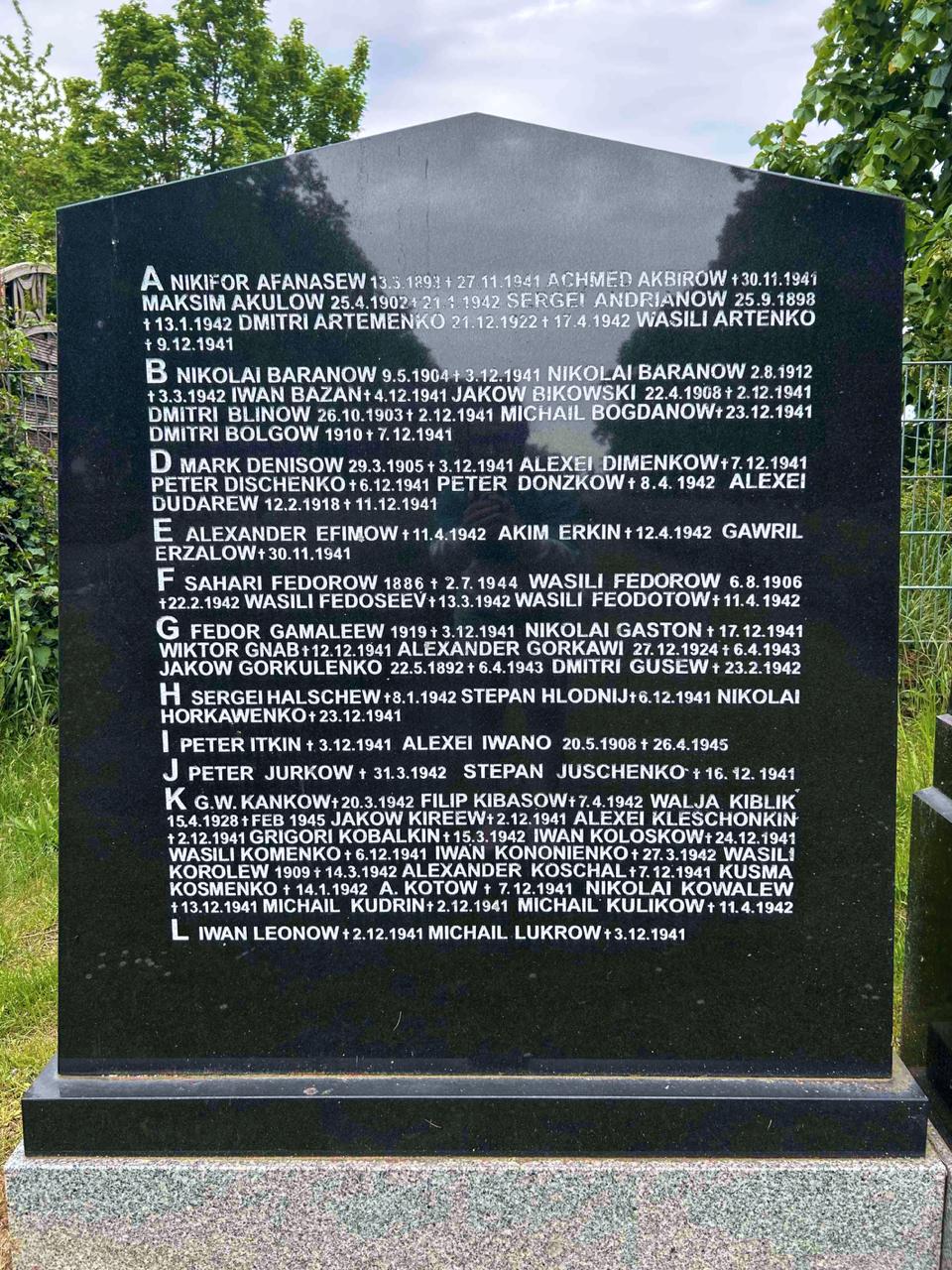 1. Фамилия Блинов Имя Дмитрий Отчество Петрович Дата рождения 26.10.1903 Место рождения Рязанская обл. Лагерный номер 15264 2. Фамилия Акбиров Имя Ахмат Отчество Галиула Дата рождения 21.12.1907 Место рождения Сардак Лагерный номер 14337 3. Фамилия Васильев Имя Петр Отчество Георгиевич Дата рождения 10.12.1895 Место рождения Смоленская обл. Лагерный номер 11365 4. Фамилия Мерцалов Имя Гавриил Отчество Леонович Дата рождения/Возраст 25.03.1908 Место рождения Курская обл. Лагерный номер 15863 5. Фамилия Быковский Имя Яков Отчество Васильевич Дата рождения 22.04.1908 Место рождения Орловская обл. Лагерный номер 15988 6. Фамилия Сац Имя Василий Отчество Кириллович Дата рождения 04.05.1918 Место рождения Брестская обл. Лагерный номер 11355 7. Фамилия Юченко Имя Степан Отчество Андреевич Дата рождения 27.12.1904 Место рождения Ярославская обл. Лагерный номер 14436 8. Фамилия Трушенко Имя Петр Отчество Васильевич Дата рождения 11.09.1914 Место рождения Курская обл. Лагерный номер 14740 9. Фамилия Муха Имя Кондрат Отчество Степанович Дата рождения 18.03.1921 Место рождения Киевская обл. Лагерный номер 15169 10. Фамилия Кастов Имя Николай Отчество Васильевич Дата рождения 06.07.1903 Место рождения Смоленская обл. Лагерный номер 14229 11. Фамилия Медведев Имя Анатолий Отчество Львович Дата рождения 03.07.1917 Место рождения Новочеркасск Лагерный номер 14671 12. Фамилия Богданов Имя Михаил Отчество Васильевич Дата рождения 22.03.1920 Место рождения Фролово Лагерный номер 15768 13. Фамилия Горкавенко Имя Николай Отчество Романович Дата рождения 12.05.1898 Место рождения Туровка Лагерный номер 14168 14. Фамилия Колосков Имя Иван Отчество Михайлович Дата рождения __.__.1916 Место рождения Тульская обл., Решко-Крапилинка Лагерный номер 15809 15. Фамилия Черенков Имя Андрей Отчество Андреевич Дата рождения __.06.1917 Место рождения М. Бешанка Лагерный номер 14852 16. Фамилия Халзов Имя Сергей Отчество Сергеевич Дата рождения __.__.1915 Место рождения Арбузовка Лагерный номер 11397 17. Фамилия Белобуев Имя Павел Отчество Никифорович Дата рождения 20.08.1909 Место рождения Курская обл. Лагерный номер 15062 18. Фамилия Кузьменков Имя Кузьма Отчество Федорович Дата рождения 12.10.1906 Место рождения Могилевская обл., Осиновка Лагерный номер 14529 19. Фамилия Андриянов Имя Сергей Отчество Ефимович Дата рождения 25.09.1898 Место рождения Калининская обл., Левоново Лагерный номер 14621 20. Фамилия Смирнов Имя Василий Отчество Григорьевич Дата рождения 20.08.1898 Место рождения Калининская обл. Лагерный номер 14730 21. Фамилия Акулов Имя Максим Отчество Ефимович Дата рождения 25.04.1902 Место рождения Городище Лагерный номер 16175 22. Фамилия Макаренко Имя Дмитрий Отчество Сергеевич Дата рождения 26.10.1907 Место рождения Черниговская обл. Лагерный номер 15165 23. Фамилия Гусев Имя Дмитрий Отчество Максимович Дата рождения __.__.1907 Место рождения Ретивцево Лагерный номер 14490 24. Фамилия Федоров Имя Василий Отчество Васильевич Дата рождения 06.08.1906 Место рождения Московская обл. Лагерный номер 15764 25. Фамилия Баранов Имя Николай Отчество Сергеевич Дата рождения 09.05.1904 Место рождения Калининская обл. Лагерный номер 15784 26. Фамилия Тапнер Имя Роберт Отчество Янович Дата рождения 31.03.1916 Место рождения Куйбышевская обл. Лагерный номер 15857 27. Фамилия Подмазко Имя Федот Отчество Даниилович Дата рождения/Возраст __.__.1914 Место рождения Одесская обл., Беляевка Лагерный номер 14106 28. Фамилия Киреев Имя Яков Отчество Алексеевич Да