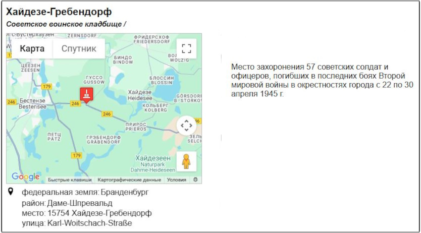 | Информация о захоронении Страна захоронения ФРГ Регион захоронения Земля Бранденбург Номер захоронения в ВМЦ 1704/88 Первичное место захоронения район Кенигс-Вустерхаузен, н.п. ГРЕБЕНДОРФ Вид захоронения Советское воинское кладбище. 4 братских, 16 одиночных могил Размеры современного места захоронения Кладбище имеет форму квадрата размером 15х15 м. Состояние захоронения хорошее Захоронено всего 57 Захоронено известных 31 Захоронено неизвестных 26 Описание памятника (надгробия) В центре находится обелиск с красной пятиконечной звездой Кто шефствует над захоронением в/ч пп 08902, совет общины н.п. Гребендорф Дополнительная информация о месте захоронения Кладбище имеет форму квадрата. В четырех его углах размещены 4 братские могилы. В два ряда по середине размещены 16 одиночных могил. На братских и одиночных могилах размещены плиты из искусственного мрамора с указанием фамилии захороненных. Бетонный обелиск имеет квадратное основание размером 3х3 м. Высота памятника 6 м. Обелиск венчает красная пятиконечная звезда. С четырех сторон обелиска имеются надписи на русском языке: "Великая Отечественная война 1941-1945 гг.", "Вечная слава героям павшим в борьбе за независимость нашей Родины". https://www.obd-memorial.ru/html/info.htm?id=250000092&page=1