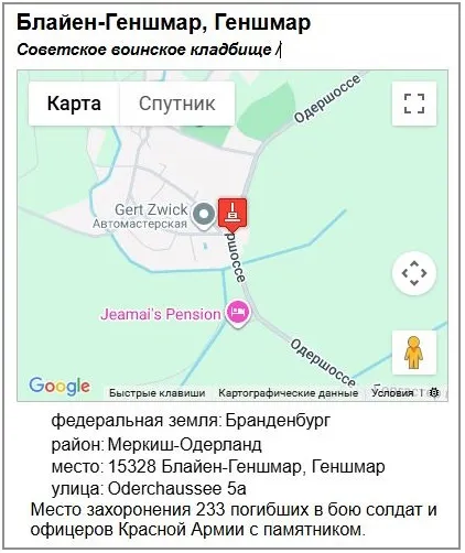 | Информация о захоронении Страна захоронения ФРГ Регион захоронения Земля Бранденбург Номер захоронения в ВМЦ 1704/161 Первичное место захоронения н.п. Геншмар, округ Франкфурт/Одер, р-н Зелов, Одершоссе. Дата создания современного места захоронения __.05.1945 Дата последнего захоронения __.05.1945 Вид захоронения Отдельно расположенная братская могила. 1 братская могила Размеры современного места захоронения Размеры кладбища 20х6 м. Состояние захоронения удовлетворительное Захоронено всего 233 Захоронено известных 233 Захоронено неизвестных - Описание памятника (надгробия) На прямоугольной площадке из каменных плиток установлен обелиск четырехгранной конической формы на постаменте, изготовленный из гранита с надписью на русском языке (на снимке). Размеры 2х9,60 м. Кто шефствует над захоронением Совет общины н.п. Геншмар, войсковая часть пп 03081, пп 61244 Дополнительная информация о месте захоронения Памятник поставлен сразу после окончания войны в мае 1945 года. По-новому оформлен в 1971 году, открытие состоялось 1 мая 1972 года. Проектировали и сооружали мемориал фрау Радакк, каменотесные мастерские г. Франкфурт/Одер. Финансировал строительство районный совет г. Зелов, из средств гос. бюджета ГДР Откуда производились перезахоронения Геншмар https://www.obd-memorial.ru/html/info.htm?id=250000064&page=1