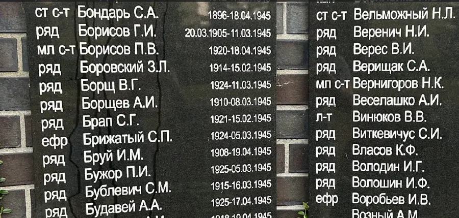 Информация о захоронении Страна захоронения ФРГ Регион захоронения Земля Бранденбург Номер захоронения в ВМЦ 1704/170 Первичное место захоронения г. Лебус, округ Франкфурт/Одер, район Зелов, ул. Линденштрассе. Дата создания современного места захоронения __.04.1945 Дата последнего захоронения __.04.1945 Вид захоронения советское воинское кладбище на котором находятся 3 братские могилы и одна индивидуальная Размеры современного места захоронения Территория кладбища около 1 га. Мемориал длиной 50 м, высота 2,30 м. Состояние захоронения удовлетворительное Захоронено всего свыше 4000 Захоронено известных 1831 Захоронено неизвестных 2172 Описание памятника (надгробия) В центре мемориала памятник в виде четырехгранной колонны с надписью на русском языке и красной звездой на вершине. Высота памятника - 8 м Кто шефствует над захоронением Городской Совет г. Лебус, войсковая часть пп 98101 Дополнительная информация о месте захоронения Памятник был поставлен в 1947-48 г.г. В 1975 г. кладбище оформлено по-новому, а в 1978 г. справа от дорожки установлена противотанковая пушка на бетонном постаменте. Сам мемориал сделан в виде каменной стены с гранитными плитами. Проект мемориала разработан советской военной комендатурой г. Зелов. Сооружали мемориал строительное хозяйство Фрелих и жители города на средства городского совета. В центре мемориала памятник с надписью на русском языке "Вечная слава героям, павшим в борьбе за свободу и независимость нашей советской Родины". Справа и слева полукругом расположены галереи с установленными мраморными плитами с известными именами погибших. Перед памятником находится братская могила в виде полукруга, справа и слева примыкают две братские могилы прямоугольной формы Откуда производились перезахоронения Лебус https://www.obd-memorial.ru/html/info.htm?id=250000069