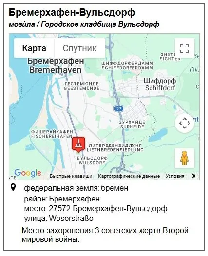 Место захоронения: г. Бремерхафен, н/п Вульсдорф, ул. Везерштрассе, 169, городское кладбище