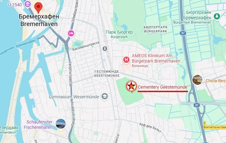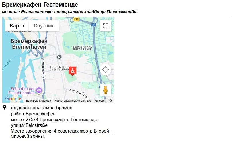 Место захоронения: г. Бремерхафен, н/п Геестемюнде, ул. Фельдштрассе, 16,