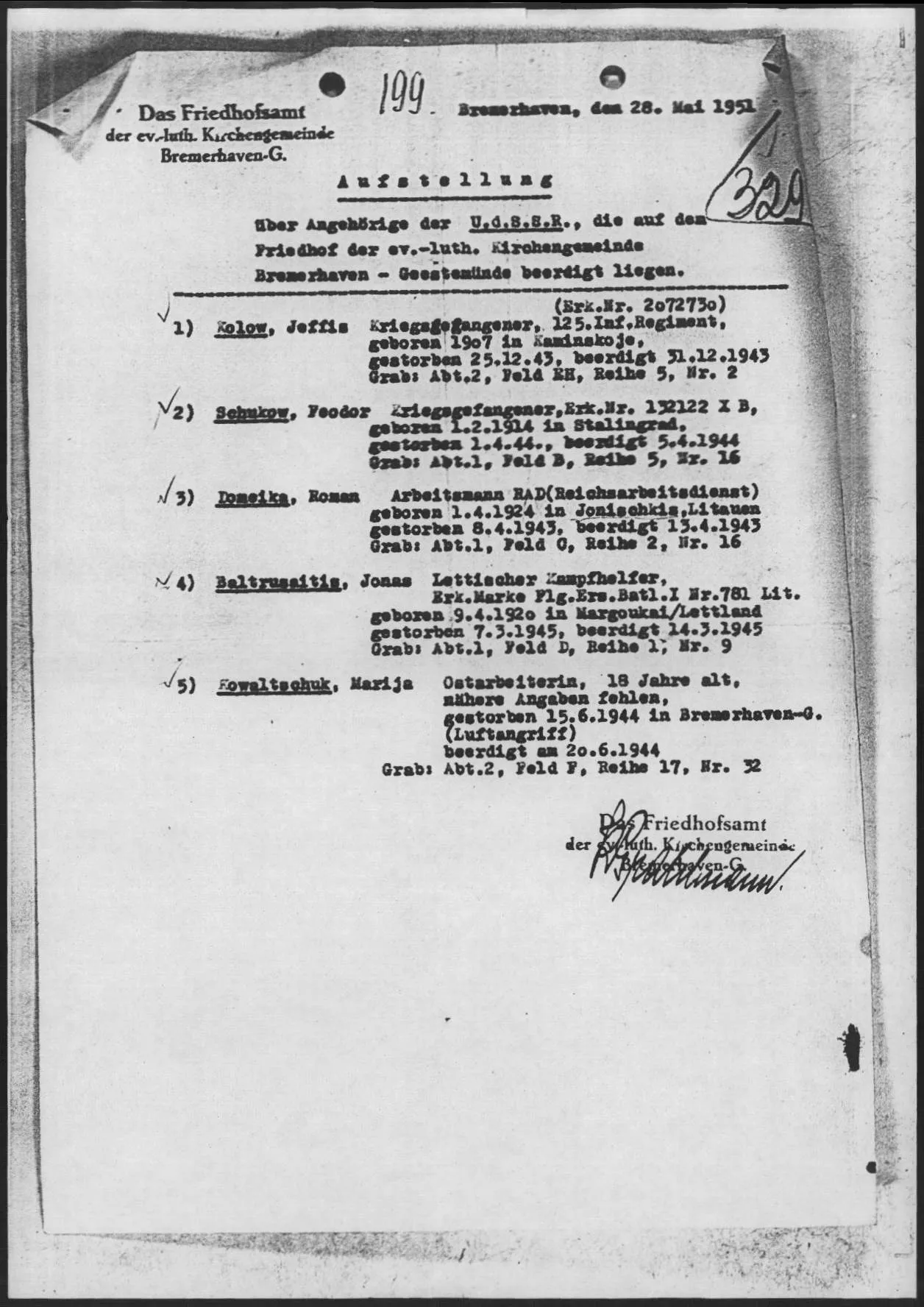 Колов Ефим и Жуков Федор (оба военнопленные) как минимум первоначально были захоронены не на городском, а не еванг.-лютеранском кладбище в Бремерхафене. См. приколотый файл.