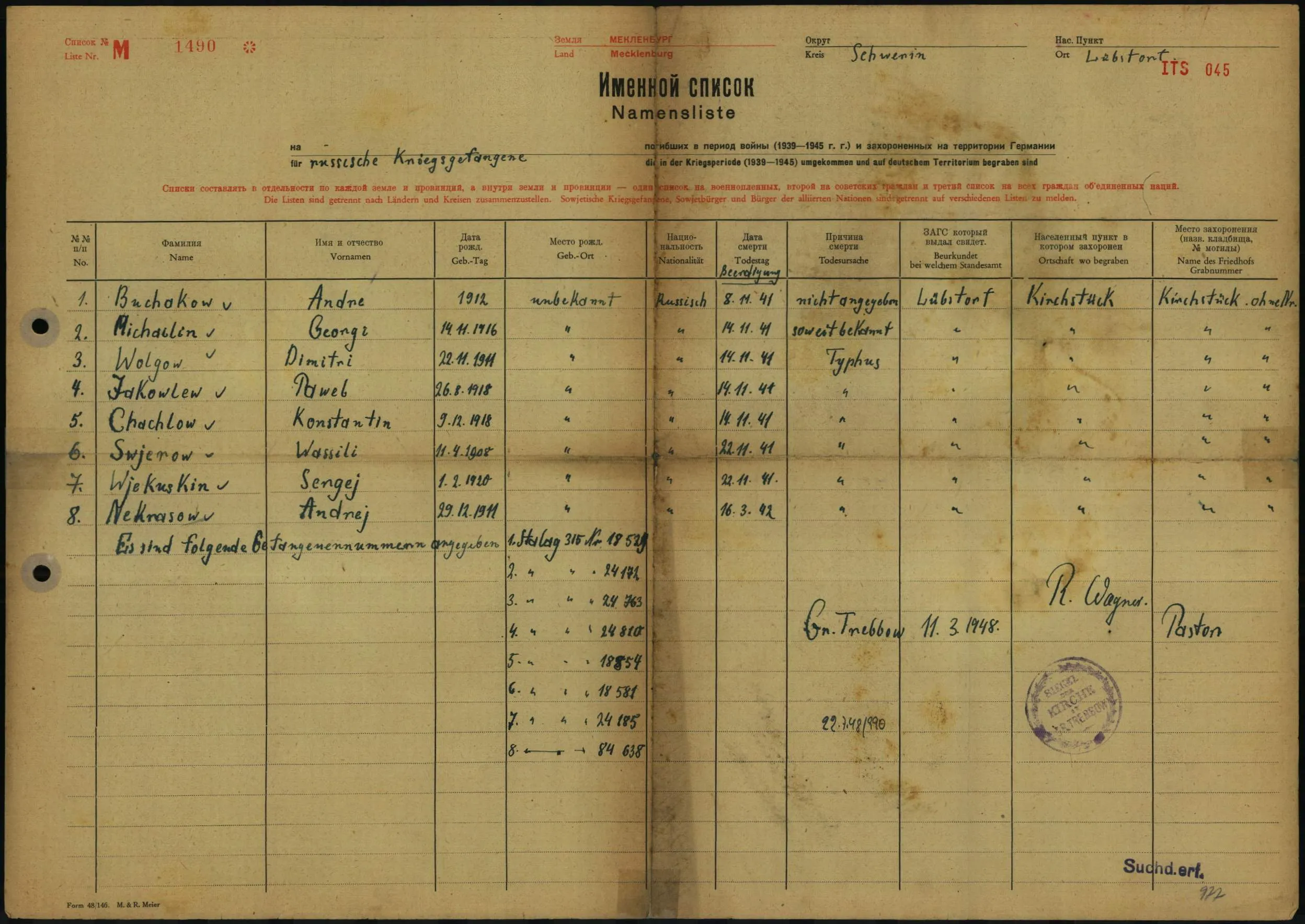 *** В PK I Хохлова (есть только титульная страница) и у Векочкина запись о смерти в лагере Lübstorf (Любсторф)
