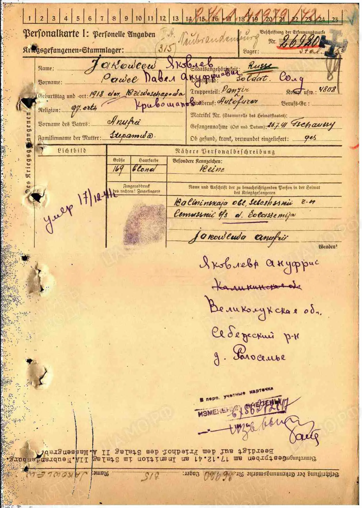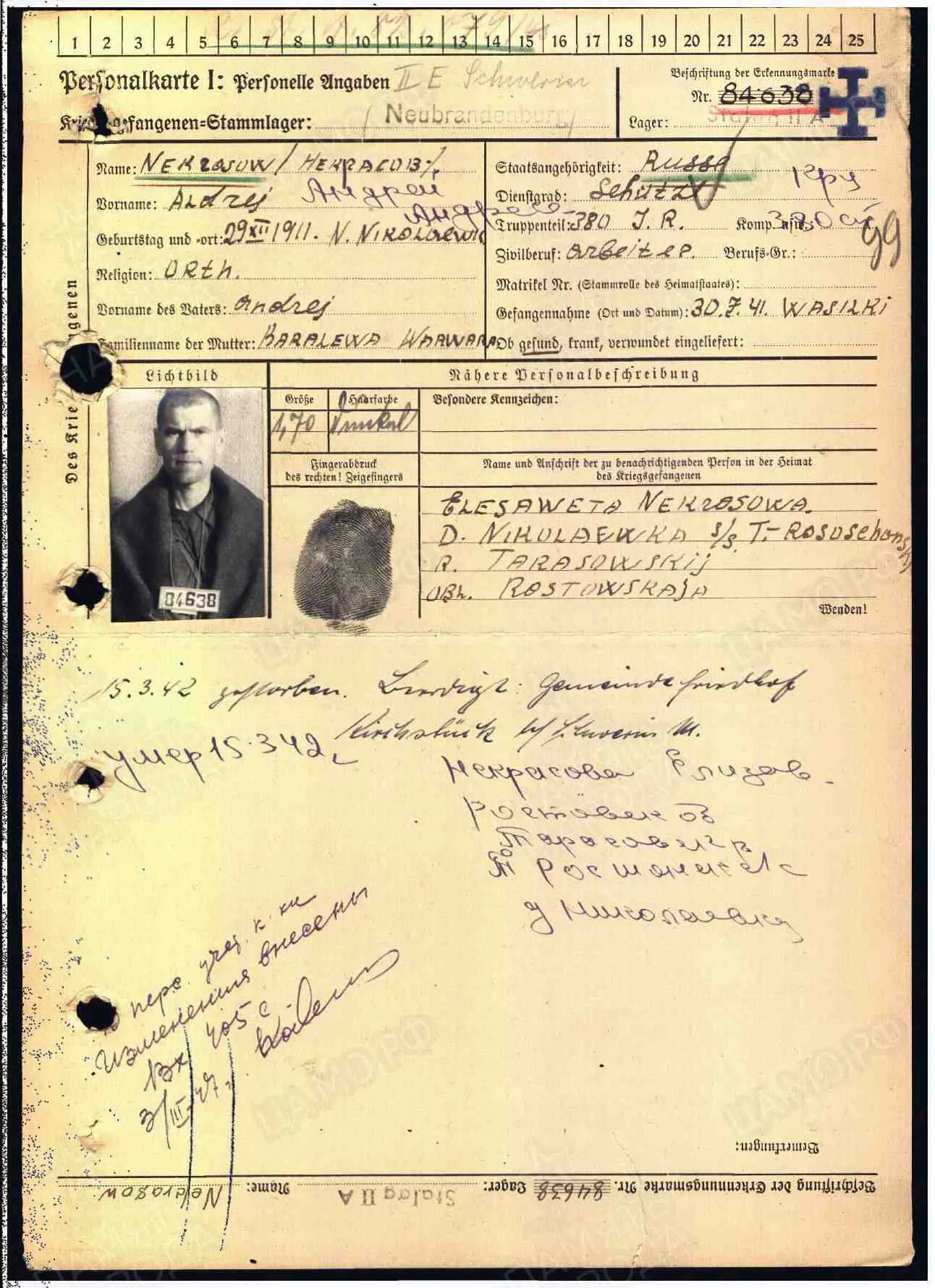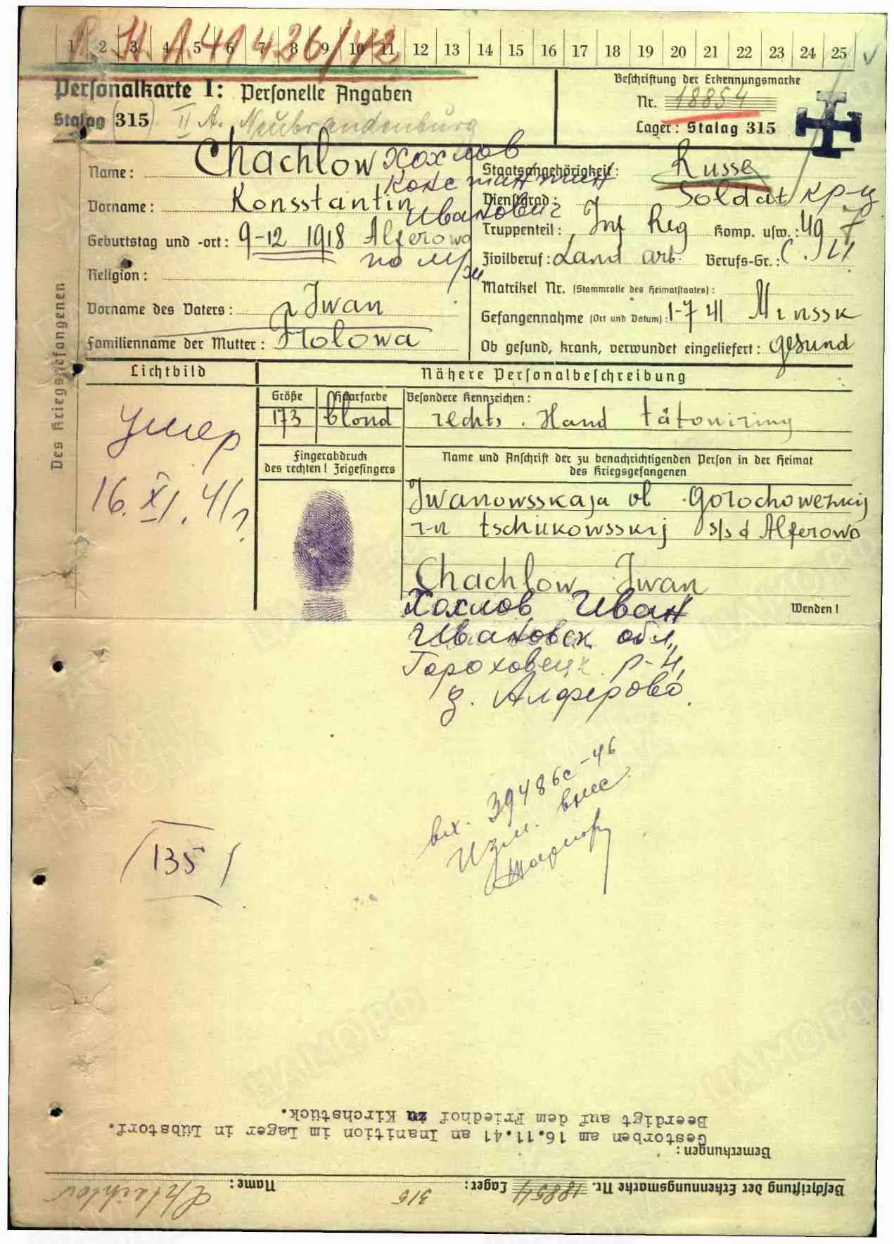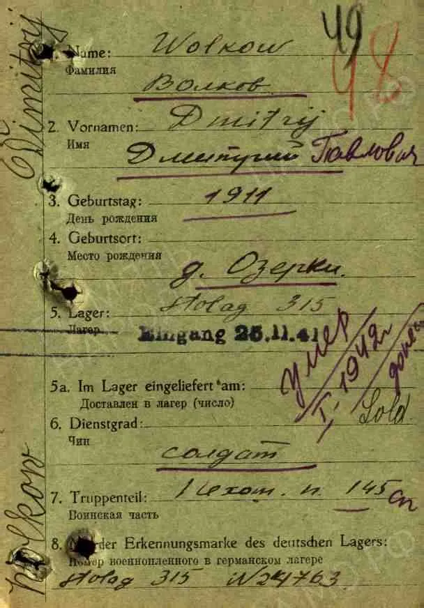 лагерный номер 24763, Stalag 315, дата смерти 14.11.1941, умер от тифа