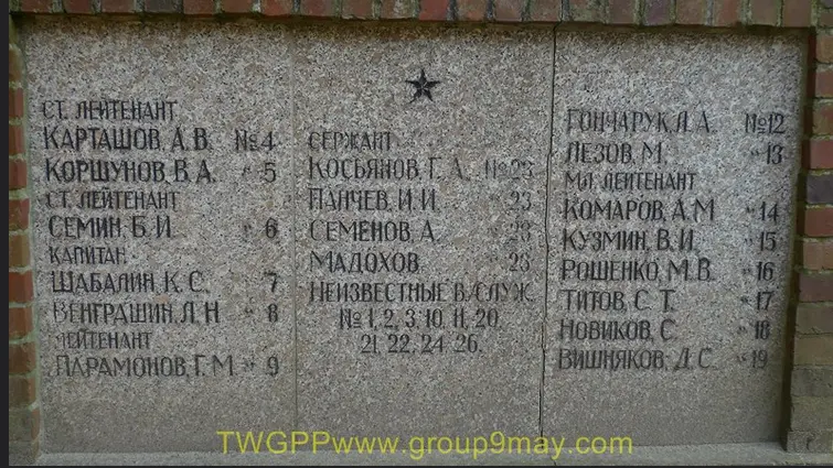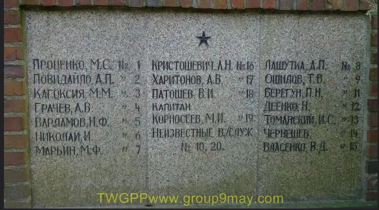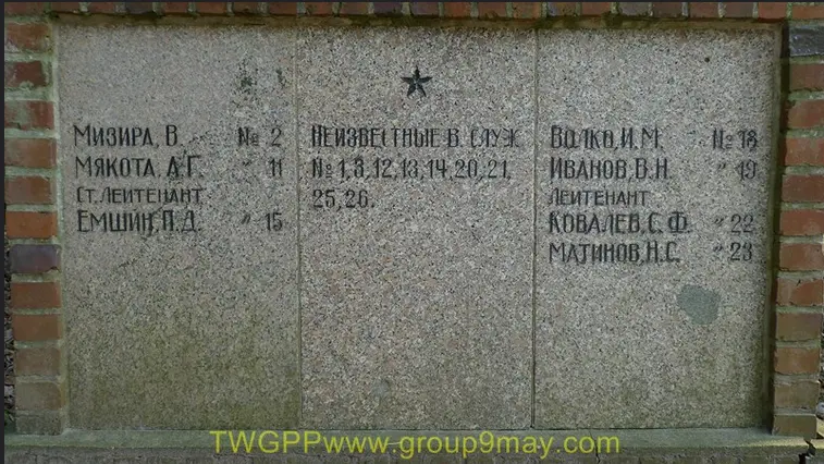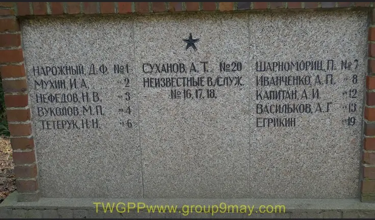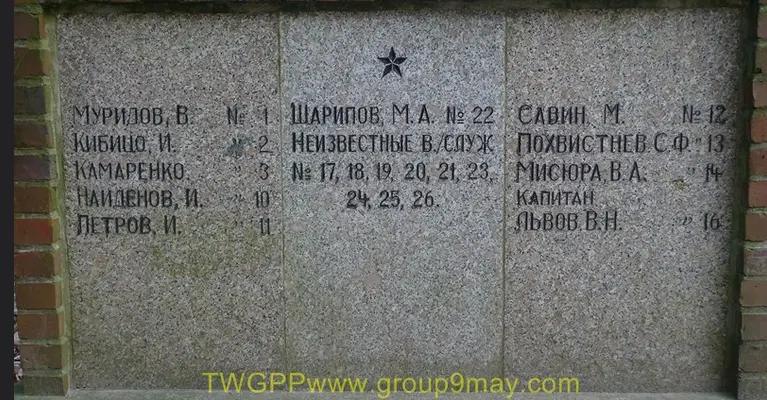 Информация о захоронении Страна захоронения ФРГ Регион захоронения Земля Мекленбург-Предпомерания Номер захоронения в ВМЦ 1708/52 Место захоронения г. Грейфсвальд Вид захоронения Советский воинский участок на территории немецкого кладбища Размеры современного места захоронения 40х55 м Состояние захоронения удовлетворительное Захоронено всего 152 Захоронено известных 93 Захоронено неизвестных 59 Описание памятника (надгробия) Памятник представляет из себя четырехгранную пирамиду высотой 6 м. Основанием пирамиды служит бетонный прямоугольник. Перед памятником справа и слева от центральной аллеи два бассейна в форме голубей. Справа и слева от памятника установлены бетонные плиты с указанием фамилий захороненных. По периметру участка высажены кусты, которые образуют живую изгородь Кто шефствует над захоронением Управление кладбищами г. Грейфсвальд http://www.obd-memorial.ru/html/info.htm?id=250000327