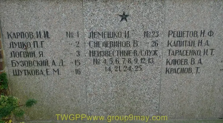 Информация о захоронении Страна захоронения ФРГ Регион захоронения Земля Мекленбург-Предпомерания Номер захоронения в ВМЦ 1708/50 Место захоронения г. Грейфсвальд, пл. Э. Тельмана Вид захоронения Советское воинское кладбище. Индивидуальных могил - 30 Размеры современного места захоронения 20х28 м Состояние захоронения удовлетворительное Захоронено всего 30 Захоронено известных 17 Захоронено неизвестных 13 Описание памятника (надгробия) В центре кладбища установлен обелиск пирамидальной формы. К нему ведет дорожка, выложенная бетонными плитами. Справа и слева от обелиска 4 ряда одиночных могил. Надгробия из гранита прямоугольной формы 90х50х10 см. Надпись высечена Кто шефствует над захоронением Управление кладбищ Дополнительная информация о месте захоронения По бокам и впереди обелиска установлены бетонные подставки для возложения венков. На обелиске надпись "Вечная память героям павшим а боях за свободу и независимость нашей Родины 1941-1945г". http://www.obd-memorial.ru/html/info.htm?id=250000326 Qui quaerit, reperit