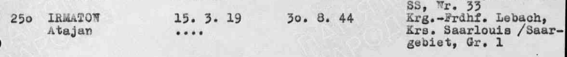 Фамилия Ирматов Имя Атаян Дата рождения/Возраст 15.03.1919 Судьба погиб в плену Дата смерти 30.08.1944 Первичное место захоронения Германия, Саксония, Саарлоис, Лебах Название источника донесения ЦАМО Номер фонда источника информации 58 Номер описи источника информации A-71744 Номер дела источника информации 1 https://obd-memorial.ru/html/info.htm?id=70787158