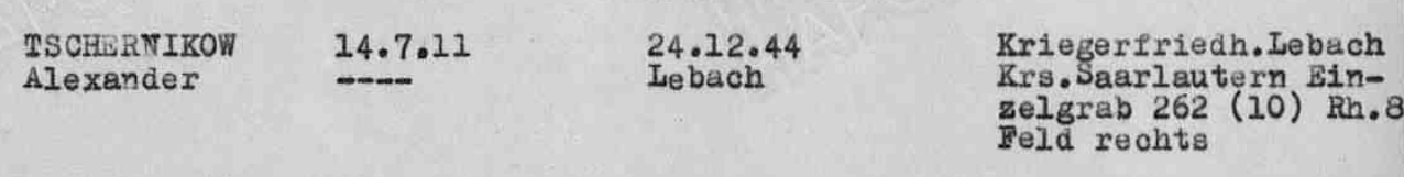 Фамилия Черников Имя Александр Дата рождения/Возраст 14.07.1911 Судьба погиб в плену Дата смерти 24.12.1944 Первичное место захоронения р-н Заарлаутерн, Лебах Название источника донесения ЦАМО Номер фонда источника информации 58 Номер описи источника информации A-71744 https://obd-memorial.ru/html/info.htm?id=81864203