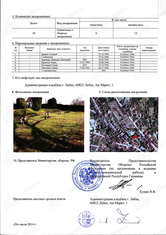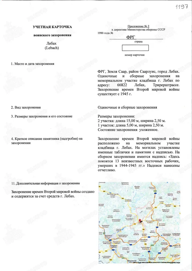 Страна захоронения ФРГ Регион захоронения Земля Саар Номер захоронения в ВМЦ З48-1197 Место захоронения Саарлуис р-н, г. Лебах, Трирерштрассе, кладбище, мемориальный участок Дата создания современного места захоронения __.__.1945 Дата последнего захоронения __.__.1945 Вид захоронения одиночные и сборные захоронения Состояние захоронения ухоженное Количество могил неизвестно Захоронено всего 19 Захоронено известных 6 Захоронено неизвестных 13 Кто шефствует Администрация кладбищ г. Лебах, 66822 Лебах, Ам Маркт, 1 https://obd-memorial.ru/html/info.htm?id=88125779