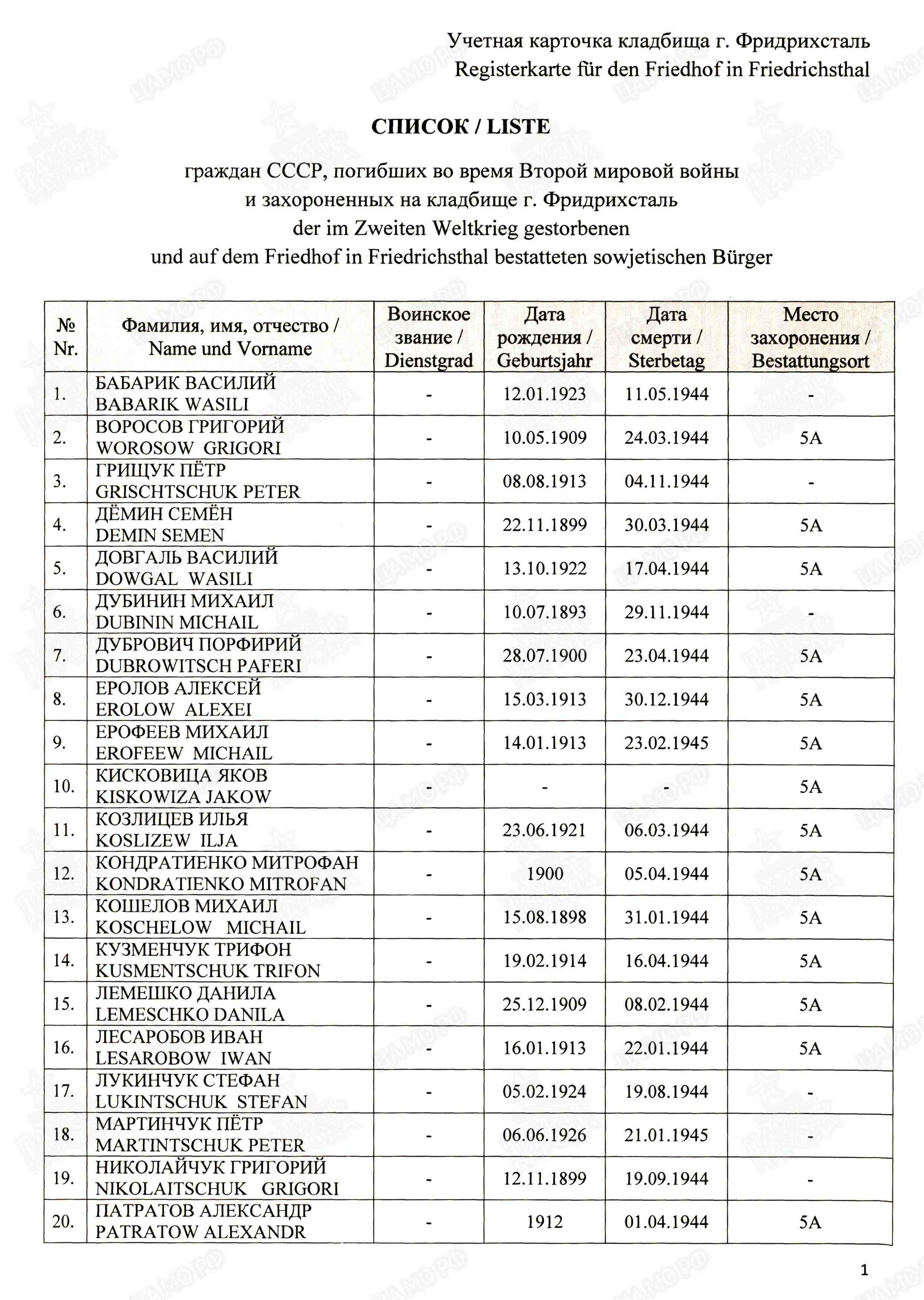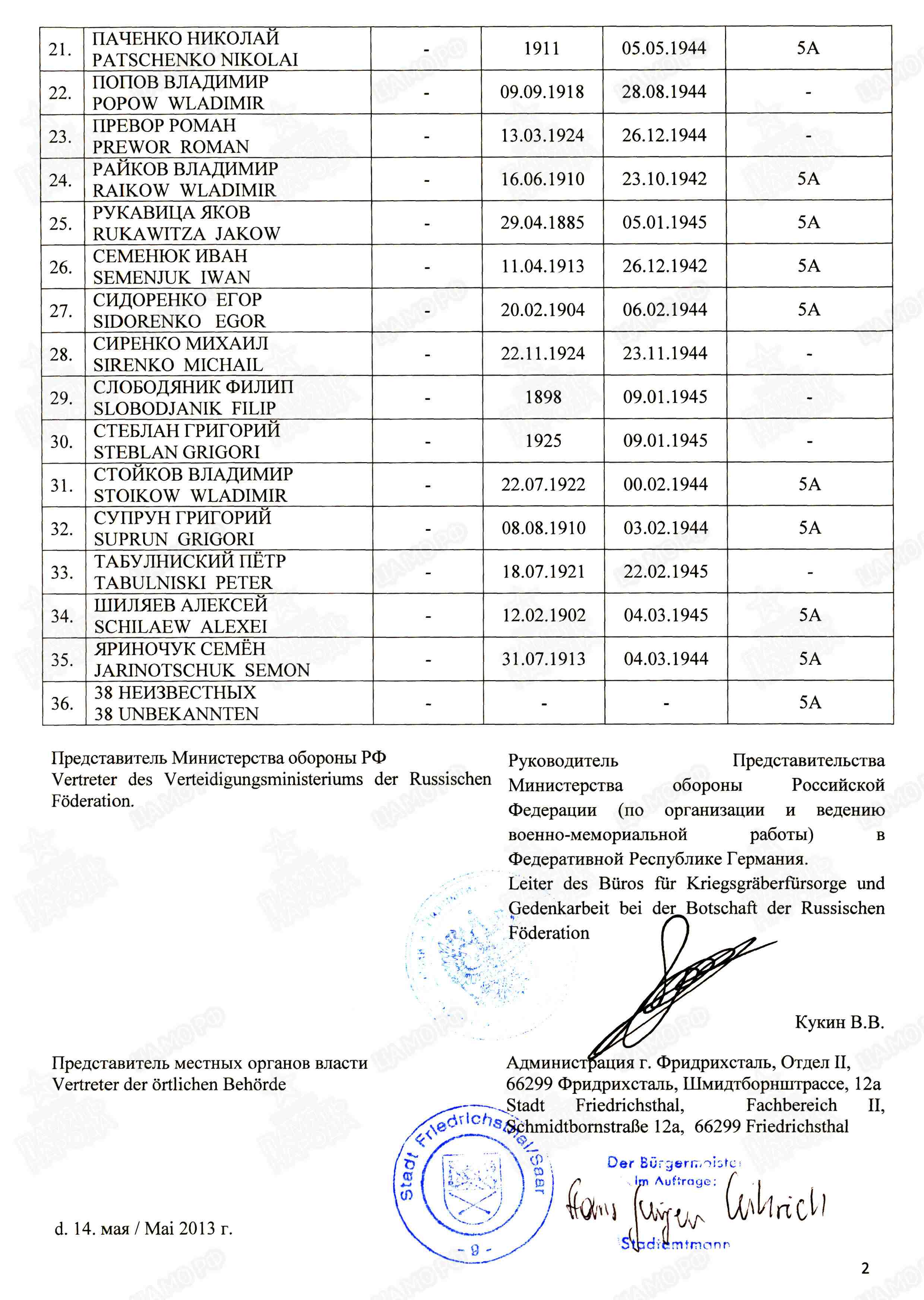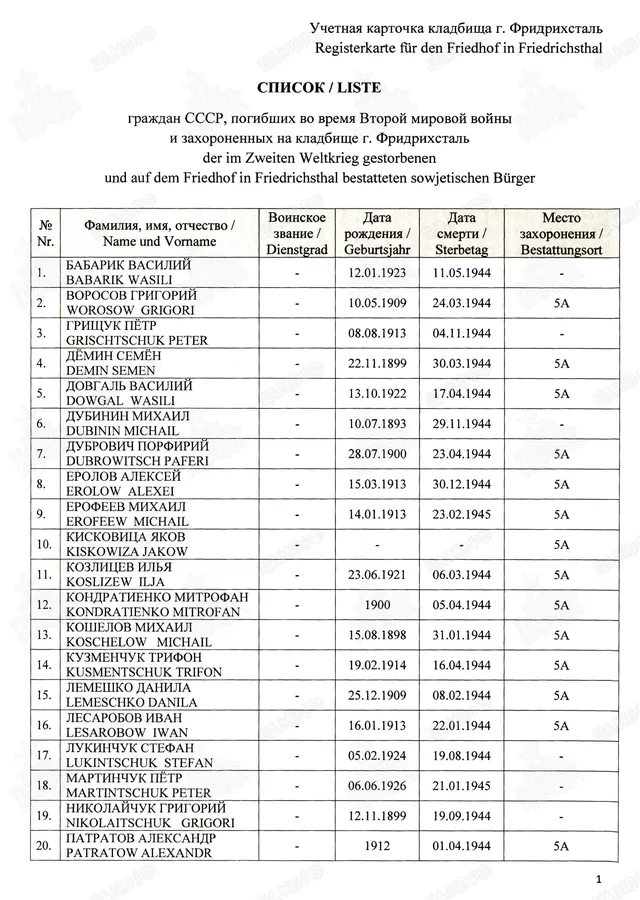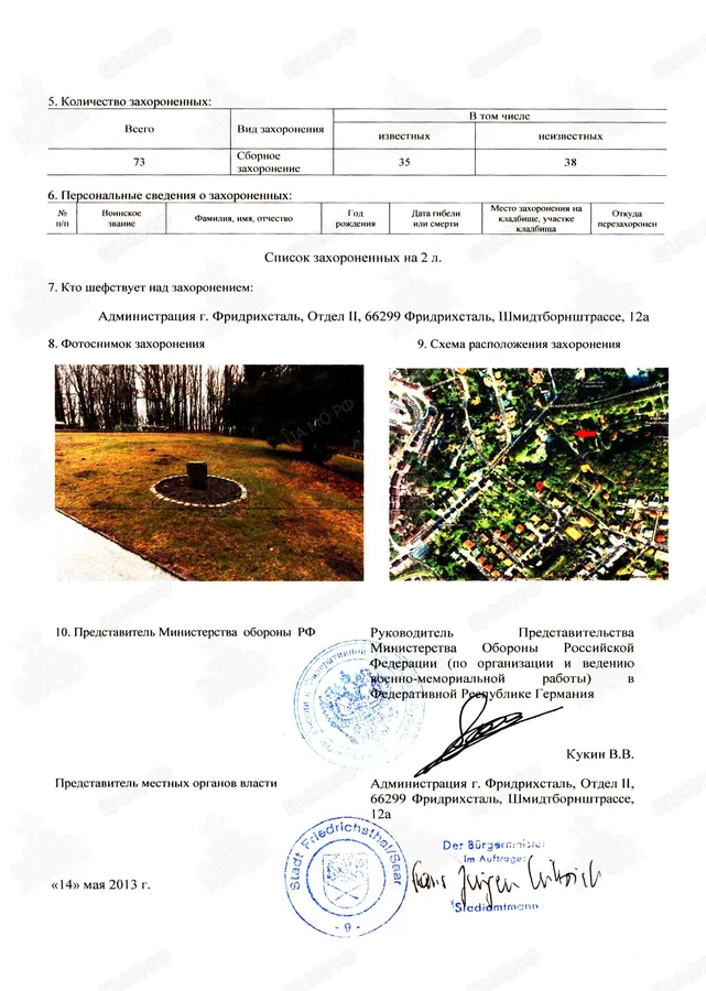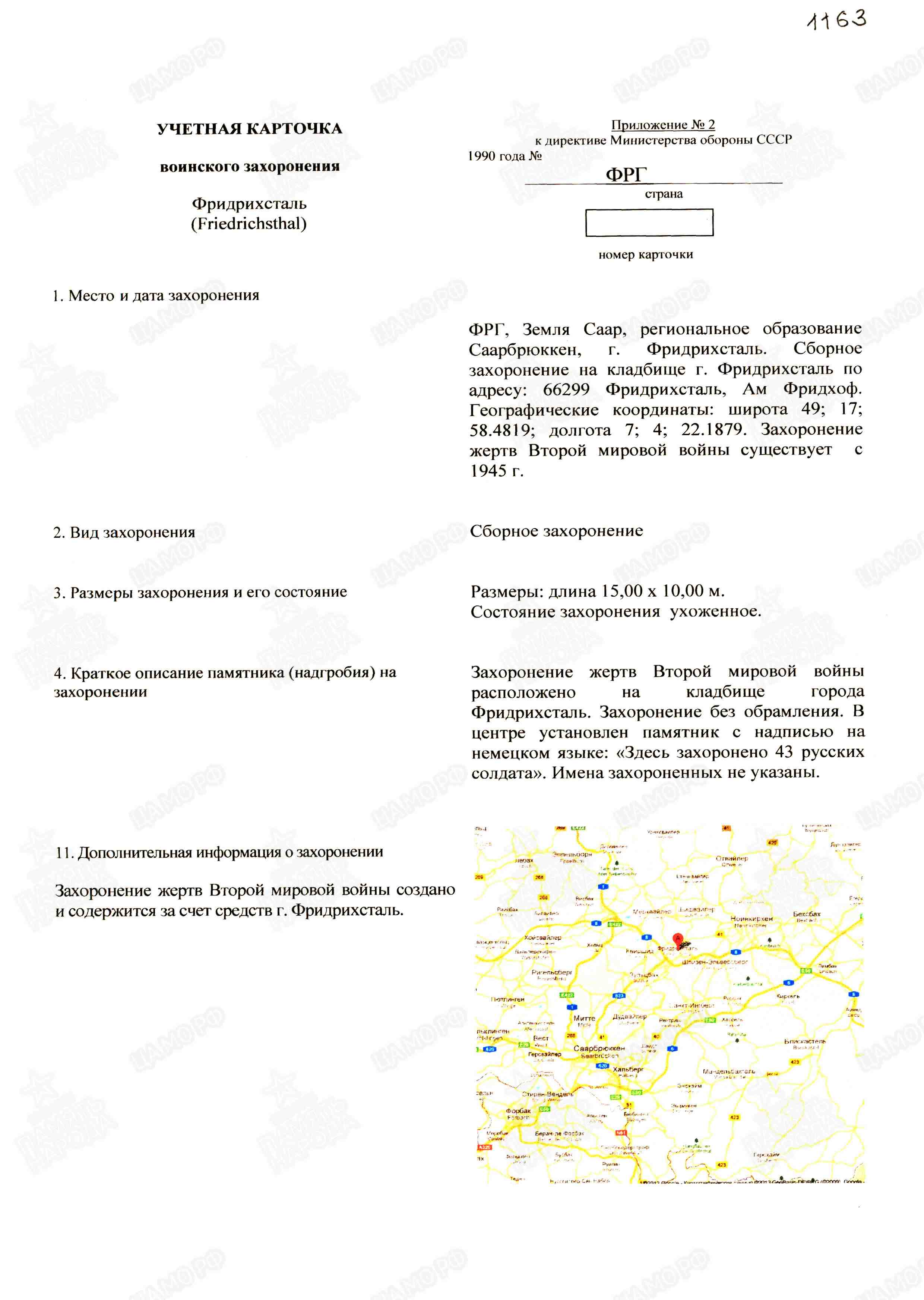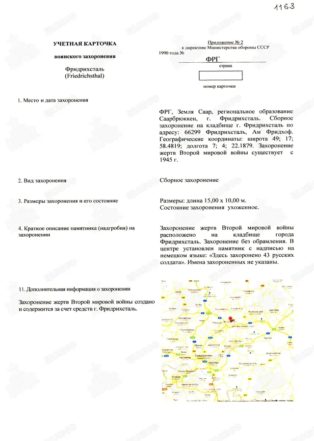 Страна захоронения ФРГ Регион захоронения Земля Саар Номер захоронения в ВМЦ З49-1163/2014 Место захоронения региональное образование Саарбрюккен, г. Фридрихсталь, Ам Фридхоф, кладбище Дата создания современного места захоронения __.__.1945 Дата последнего захоронения __.__.1945 Вид захоронения сборное захоронение Состояние захоронения ухоженное Количество могил неизвестно Захоронено всего 73 Захоронено известных 35 Захоронено неизвестных 38 Кто шефствует над захоронением Администрация г. Фридрихсталь, Отдел II https://obd-memorial.ru/html/info.htm?id=33076460