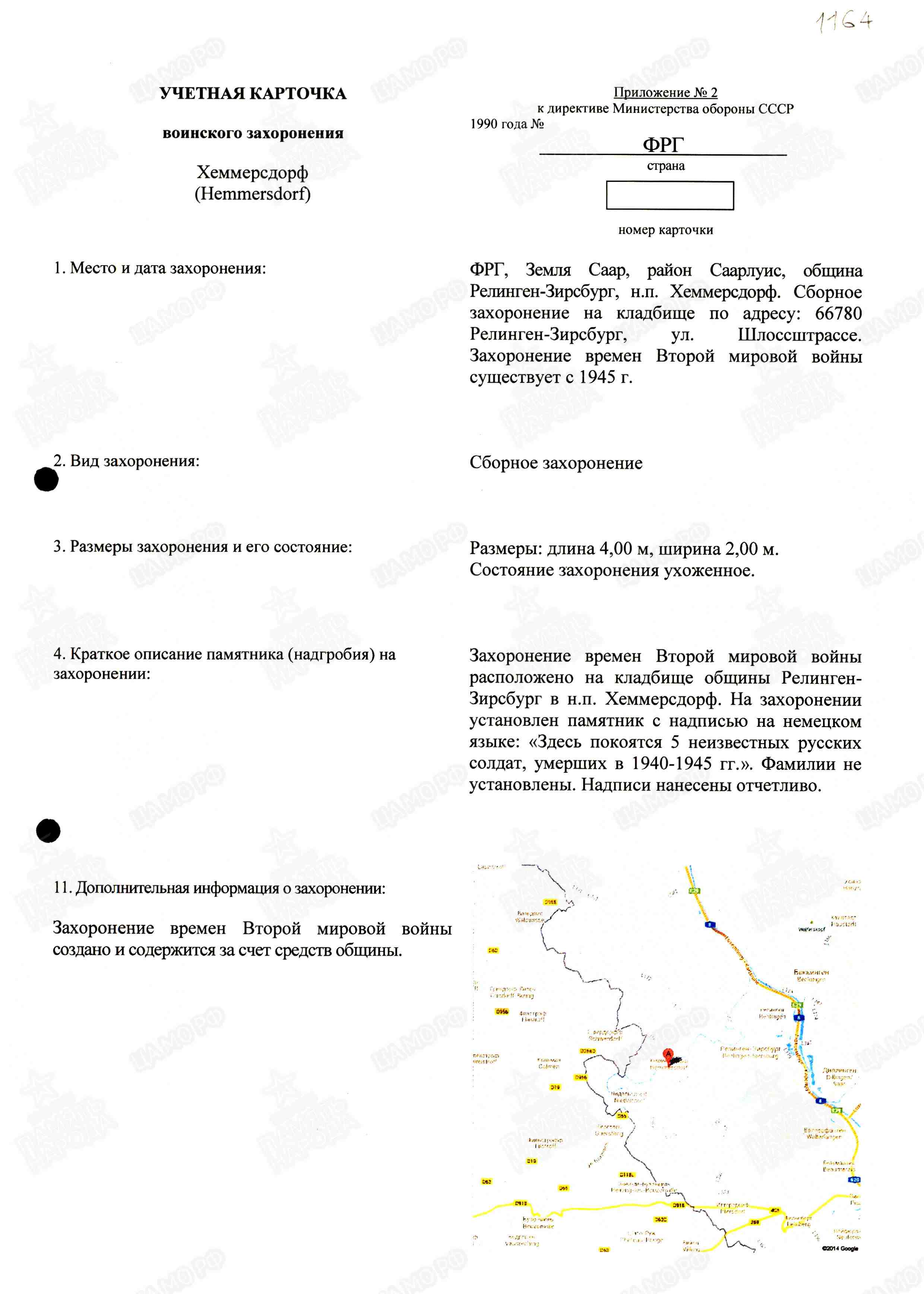 | Авиации СГВ МЕМОРИАЛЫ И ЗАХОРОНЕНИЯ СОВЕТСКИХ ВОИНОВ ВОИНСКИЕ ЗАХОРОНЕНИЯ В ГЕРМАНИИ Земля Саар ФРГ Захоронение Хеммерсдорф (нем. Hemmersdorf) (Земля Саар) |