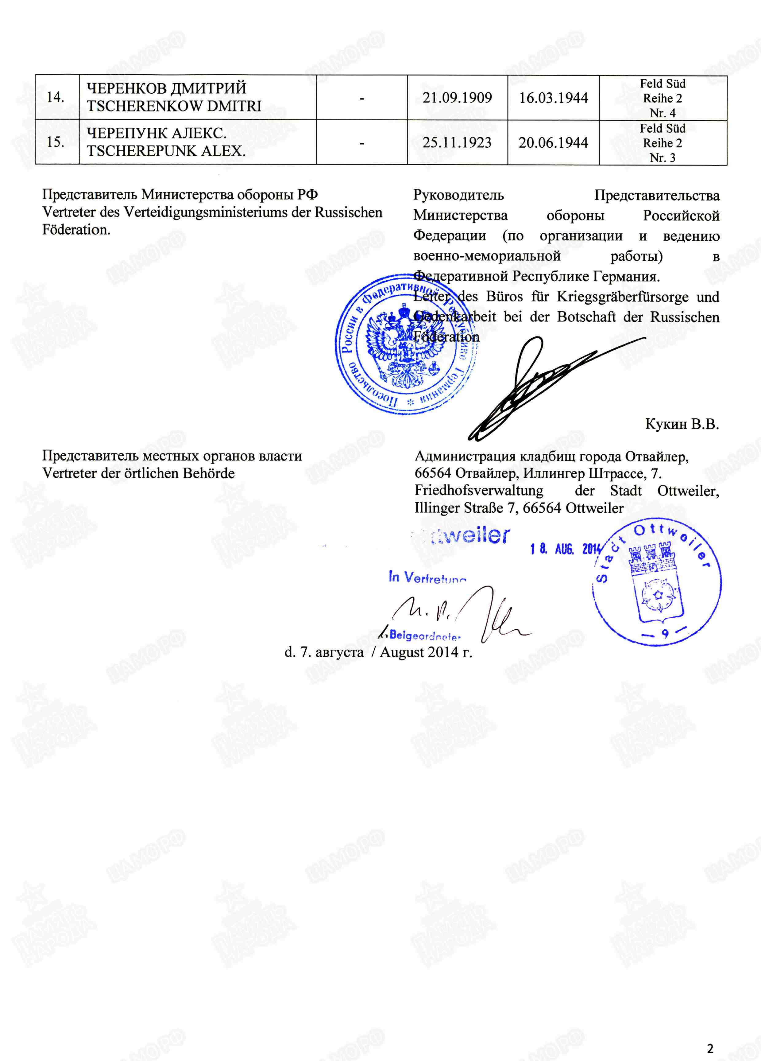 Информация о захоронении ID 33078353 Добавить в избранное Страна захоронения ФРГ Регион захоронения Земля Саар Номер захоронения в ВМЦ З49-1204/2014 Место захоронения р-н Нойнкирхен, г. Отвайлер, Земинарштрассе, евангелическое кладбище Дата создания современного места захоронения __.__.1945 Дата последнего захоронения __.__.1945 Вид захоронения сборное захоронение Состояние захоронения ухоженное Количество могил неизвестно Захоронено всего 15 Захоронено известных 15 Захоронено неизвестных 0 Кто шефствует над захоронением Администрация кладбищ г. Отвайлер https://obd-memorial.ru/html/info.htm?id=33078353