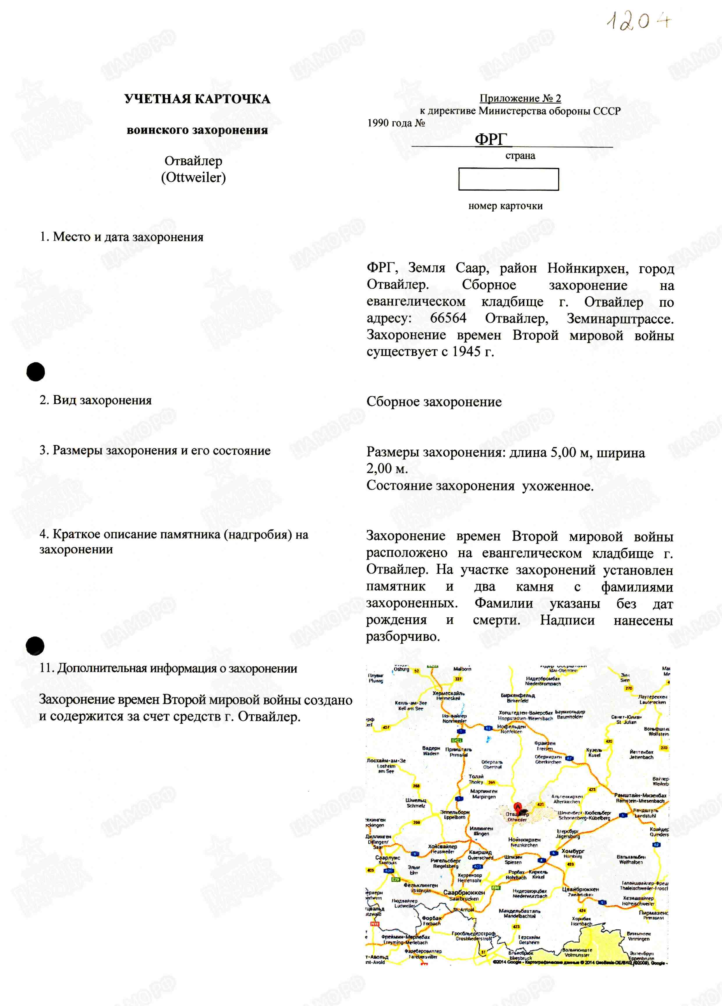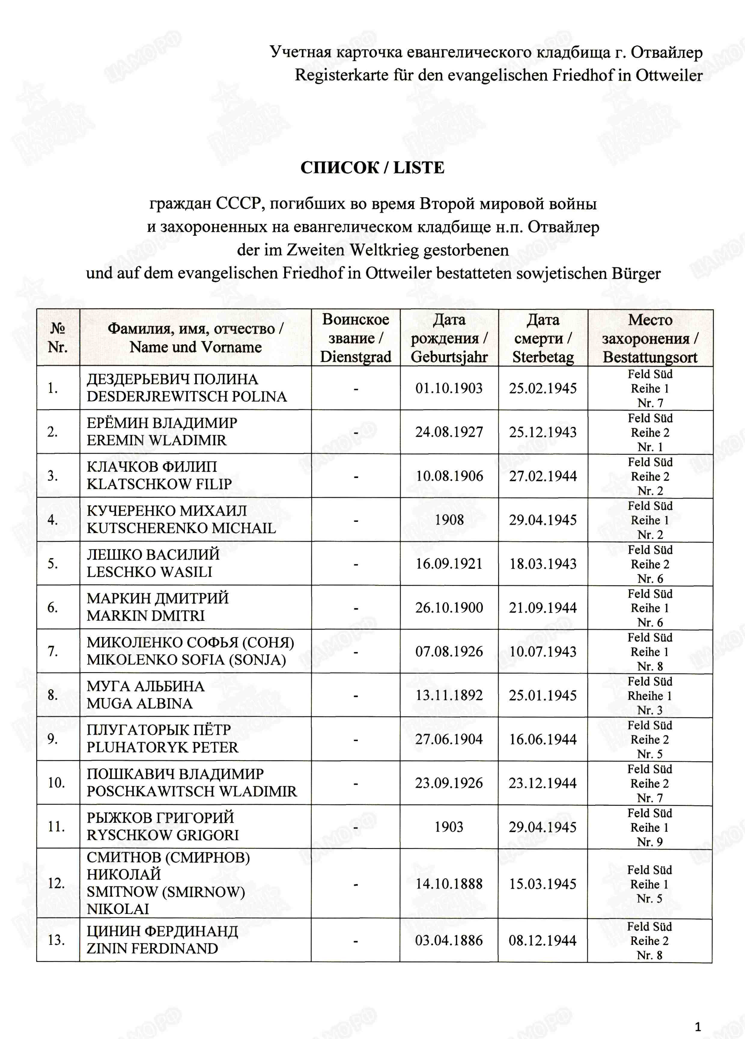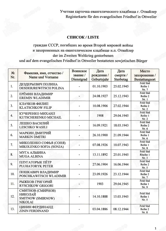 Страна захоронения ФРГ Регион захоронения Земля Саар Номер захоронения в ВМЦ З49-1205/2014 Место захоронения р-н Нойнкирхен, г. Отвайлер, Фридхофсштрассе, католическое кладбище Дата создания современного места захоронения __.__.1945 Дата последнего захоронения __.__.1945 Вид захоронения сборное захоронение Состояние захоронения ухоженное Количество могил неизвестно Захоронено всего 1 Захоронено известных 1 Захоронено неизвестных 0 Кто шефствует над захоронением Администрация кладбищ г. Отвайлер https://obd-memorial.ru/html/info.htm?id=33078373