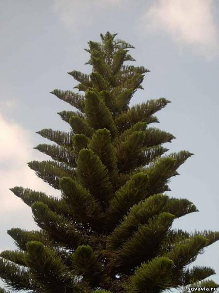 Витя, это хвойное дерево с названием араукария. Араукария (Araucaria) - медленно растущее хвойное растение, которое легко культивируется в комнатных условиях, принадлежит к семейству араукариевые (Araucariaceae). Это вечнозеленые деревья до 60 м высотой - распространены в Южной Америке, Восточной Австралии, на островах Норфолк и Новая Каледония. В роде 14 видов. В Израиле такие деревья выращивают в питомниках и используют вместо елки на новый год. А кое-кто их просто сажает у себя в садике как красивое декоративное дерево.