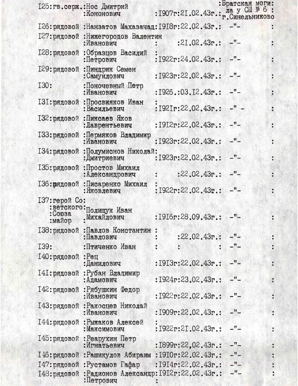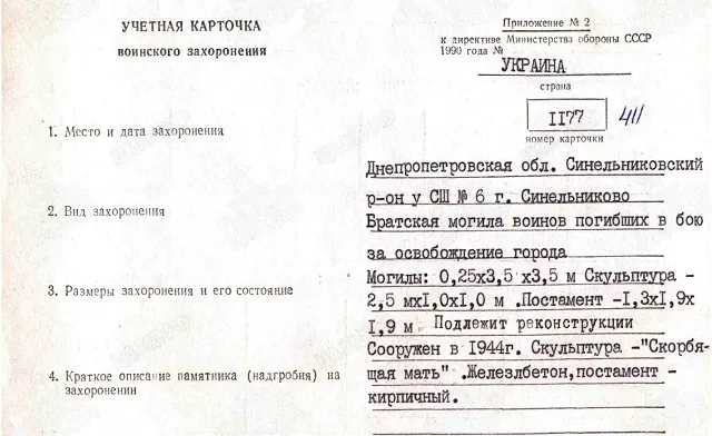 | Авиации СГВ МЕМОРИАЛЫ И ЗАХОРОНЕНИЯ СОВЕТСКИХ ВОИНОВ ВОИНСКИЕ ЗАХОРОНЕНИЯ НА УКРАИНЕ Днепропетровская обл. Воинское захоронение Синельниково (укр. Синельникове) (Братская могила воинов РККА у СШ № 6) |