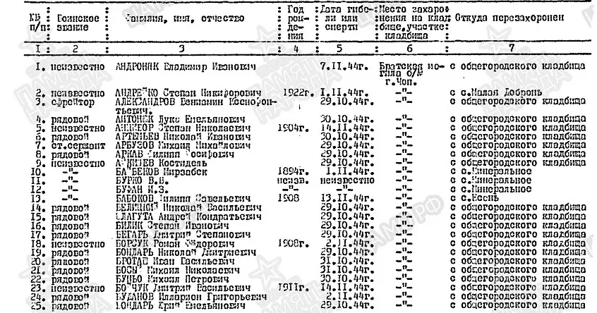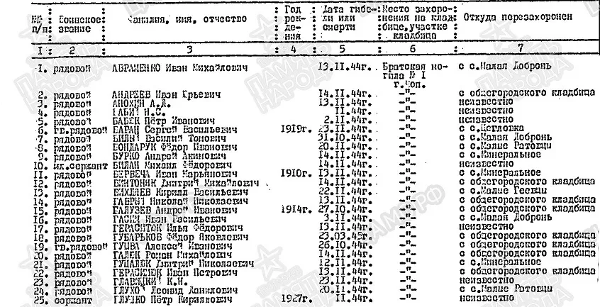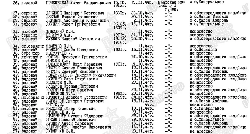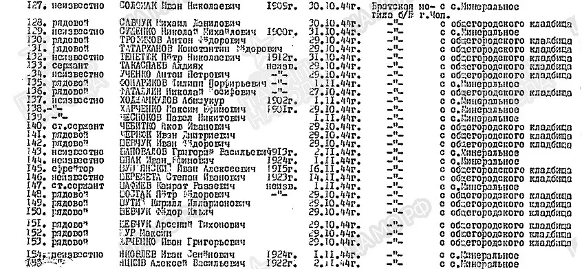 Фамилия Практика Имя Степан Отчество Васильевич Дата рождения/Возраст __.__.1913 Место рождения Львовская обл., Великомостовский р-н Дата и место призыва Великомостовский РВК, Украинская ССР, Львовская обл., Великомостовский р-н Последнее место службы 237 сд Воинское звание рядовой Причина выбытия убит Дата выбытия 28.10.1944 Первичное место захоронения Чехословакия, г. Чоп, западная окраина Название источника донесения ЦАМО Номер фонда источника информации 58 Номер описи источника информации 18002 Номер дела источника информации 1425 https://obd-memorial.ru/html/info.htm?id=56074705 Николай Викторович 14 ОА ПВО 1974-1976 У России только два союзника - это Армия и Флот
