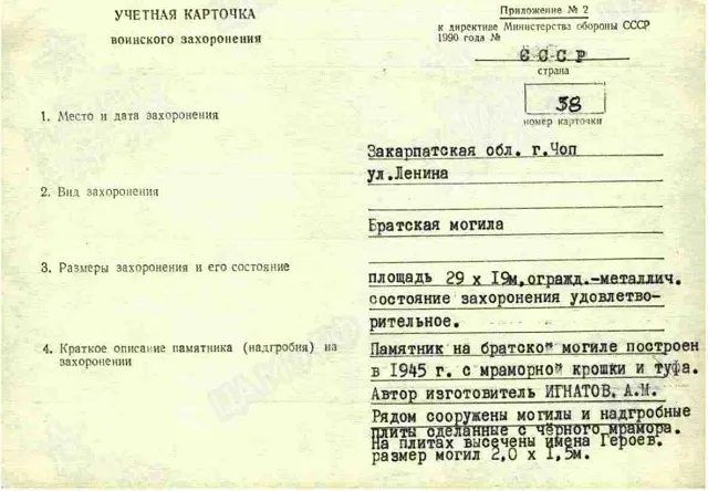 Страна захоронения Украина Регион захоронения Закарпатская обл. Номер захоронения в ВМЦ З380-87 Место захоронения г. Чоп, ул. Ленина Вид захоронения братская могила Состояние захоронения удовлетворительное Количество могил 1 Захоронено всего 262 Захоронено известных 262 Захоронено неизвестных 0 Кто шефствует над захоронением СШ № 1 г. Чоп; ОКПП "Чоп" https://obd-memorial.ru/html/info.htm?id=261913655&p=1