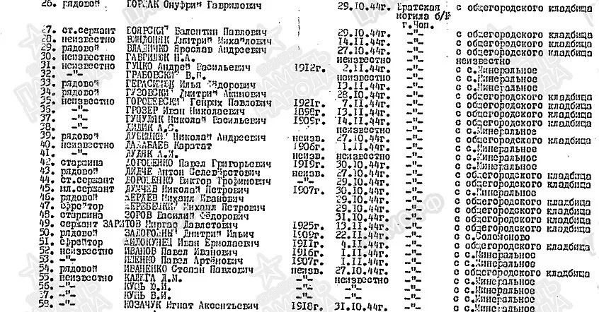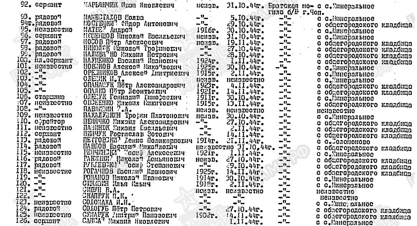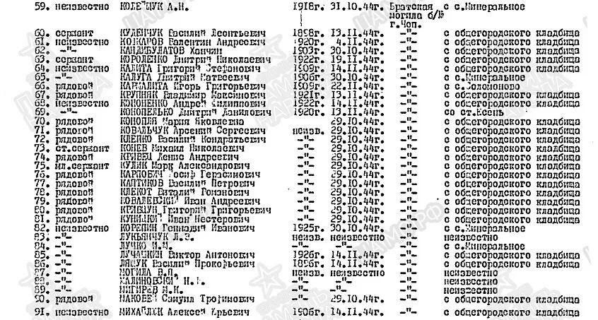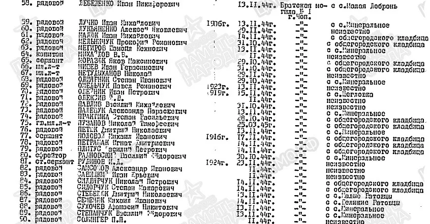 № 66 Фамилия Кармалита Имя Игорь Отчество Григорьевич Дата рождения/Возраст __.__.1909 Воинское звание рядовой Дата смерти 22.11.1944 Страна захоронения Украина Регион захоронения Закарпатская обл. Место захоронения г. Чоп, ул. Ленина Откуда перезахоронен С с. Соломново Могила Братская могила б/№ https://obd-memorial.ru/html/info.htm?id=261913838