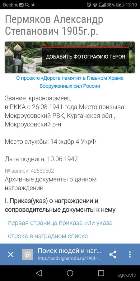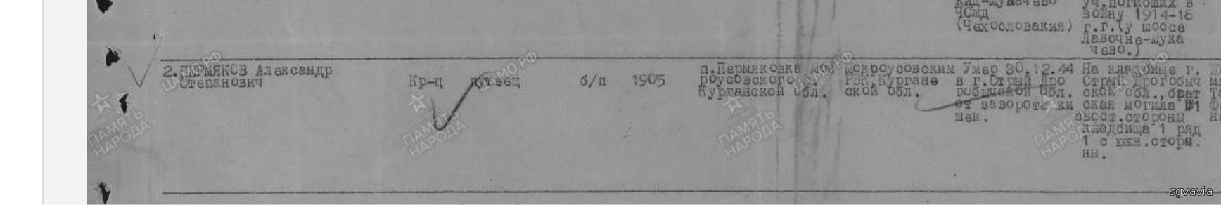 На этом форуме можно найти фото захоронения? Прадед Фамилия: Пермяков Имя: Александр Отчество: Степанович Дата рождения/Возраст: __.__.1905 Место рождения: Курганская обл., Мокроусовский р-н, п. Пермяковка Дата и место призыва: Мокроусовский РВК, Курганская обл., Мокроусовский р-н Последнее место службы: 14 ждбр Воинское звание: красноармеец Причина выбытия: умер от болезни Дата выбытия: 30.12.1944 Первичное место захоронения: Украинская ССР, Дрогобычская обл., Стрыйский р-н, г. Стрый, кладбище, братская могила № 1, с восточной стороны кладбища 1 ряд, 1 с южной стороны Название источника донесения: ЦАМО Номер фонда источника информации: 58 Номер описи источника информации: 18003 Номер дела источника информации: 67 https://obd-memorial.ru/html/info.htm?id=57938954