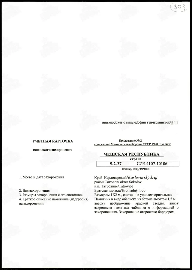 Документально описаны две жертвы этого отряда, чья судьба и обстоятельства смерти несколько загадочны. В немецких карточках военнопленных указаны имена двух погибших русских: Василия Васильевича Яковлева, рядового 32-го строительного батальона, родившегося 21 декабря 1918 года в Калининской области, и Германа Григорьевича Кудрявцева, рядового 477-го артиллерийского полка, родившегося 2 октября 1919 года в Свинино. У обоих есть записка, в которой говорится, что они были расстреляны при побеге под Татровице 14 августа 1943 года. Два дня спустя, согласно записке на открытке, их тела были похоронены на Татровицком кладбище, где они покоятся и по сей день. После войны на их могилах был установлен памятник. Ныне покойный исследователь Соколовского региона Иржи Джон запечатлел в своей неопубликованной рукописи о лагерях в Соколовском регионе воспоминание об их смерти, написанное Леоном Мруком, польским военнопленным, находившимся в то время в Татровице, который остался в Соколовском регионе после войны и жил во Вржесове. Однако Иржи Джон пишет примерно следующее: «16 августа 1943 года двое советских заключенных из лагеря Клингергольц на Соколовском химическом заводе были расстреляны при побеге недалеко от деревни Татровице – Олег Писанский и Николай Сидоренко. Их похоронили в лесу на месте казни, а после войны перенесли на местное кладбище». Дата и место полностью соответствуют описанному выше побегу заключенных из Красны, но имена – нет. В этом нет ничего особенного, Иржи Джон не знал сохранившихся карточек заключенных, которым мы, безусловно, можем больше доверять, поскольку они относятся к военному времени, и он мог ошибиться. Однако оба указанных им имени встречаются и в других источниках (особенно в Центральном реестре военных захоронений), а в архиве Соколовского есть также фотография 1963 года, на которой изображена пожилая женщина у памятника в Татровице, а на обороте надпись: «Посещение матери А. Писанского у могилы её сына. Она принесла ему кусочек родной земли из Житомира». Советские солдаты иногда не называли свои настоящие имена при попадании в плен по разным причинам (особенно офицеры или политические деятели), поэтому эта нередкая путаница в именах вполне объяснима. Тем не менее, оба имени, Писанский и Сидоренко, действительно фигурируют в списках советских военных потерь. Оба, как Кудрявцев и Яковлев, числились пропавшими без вести при отступлении советской армии летом и осенью 1941 года. Местом рождения Писанского указана Село Волица, Житомирская область, Украина, что соответствует надписи на фотографии с его предполагаемой матерью. Эти факты ещё больше углубляют тайну, как и тот факт, что, в отличие от большинства других заключённых, у Кудрявцева и Яковлева в карточке есть запись о том, что 21 июля 1943 года, то есть незадолго до их побега и смерти, им было приказано хранить молчание. К сожалению, мы не знаем, что это за факт. Вероятно, это навсегда останется загадкой, как и тот факт, кто из советских солдат на самом деле спит вечным сном в Татровице…
