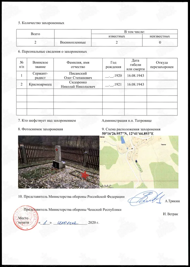 Сидоренко Николай Николаевич, 1921 г.р., СССР, рядовой, 1939 г.р. приписан к железнодорожным войскам. С 1941 г.р. приписан к 75-му отдельному строительному подразделению в Шелетовке. Он был захвачен в Житомирской области во время отступления фронта в 1941 году, содержался в плену в селе Федоровка, в 1942 году вместе с другими был депортирован на территорию бывшей Чехословакии на химический завод, где в 1943 году был расстрелян за диверсию на заводе. В 1962 году отец посетил Чехословакию, в том числе могилу сына, и поддерживает связь с гражданином Чехословацкой Республики П. К. Сичем. Сын похоронен в Татровице.