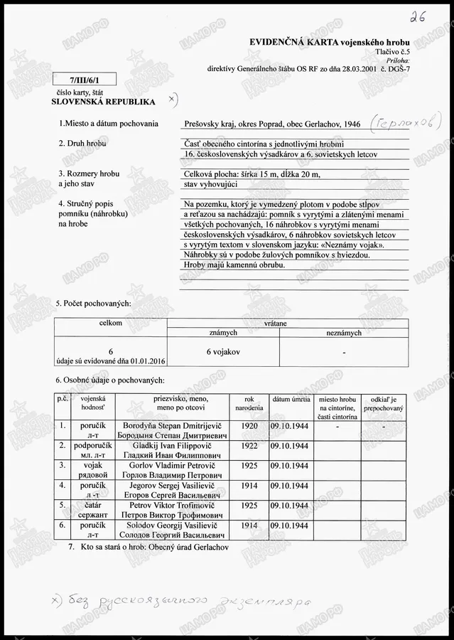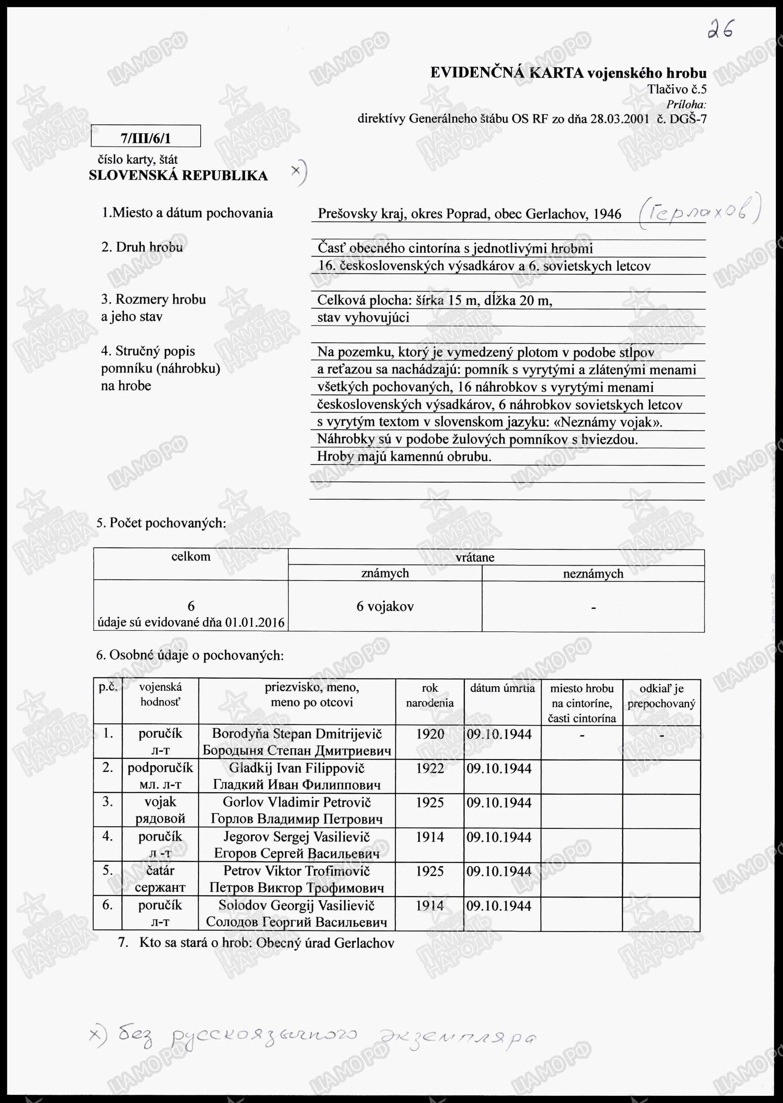 Страна захоронения Словакия Регион захоронения Прешовский край Номер захоронения в ВМЦ З421-20 Место захоронения округ Попрад, г. Герлахов, часть общего кладбища Дата создания современного места захоронения 28.07.1946 Дата последнего захоронения 28.07.1946 Вид захоронения отдельные могилы Состояние захоронения удовлетворительное Количество могил 6 Захоронено всего 6 Захоронено известных 6 Захоронено неизвестных 0 Кто шефствует над захоронением Муниципальное управление г. Герлахов https://obd-memorial.ru/html/info.htm?id=1151430319&p=1
