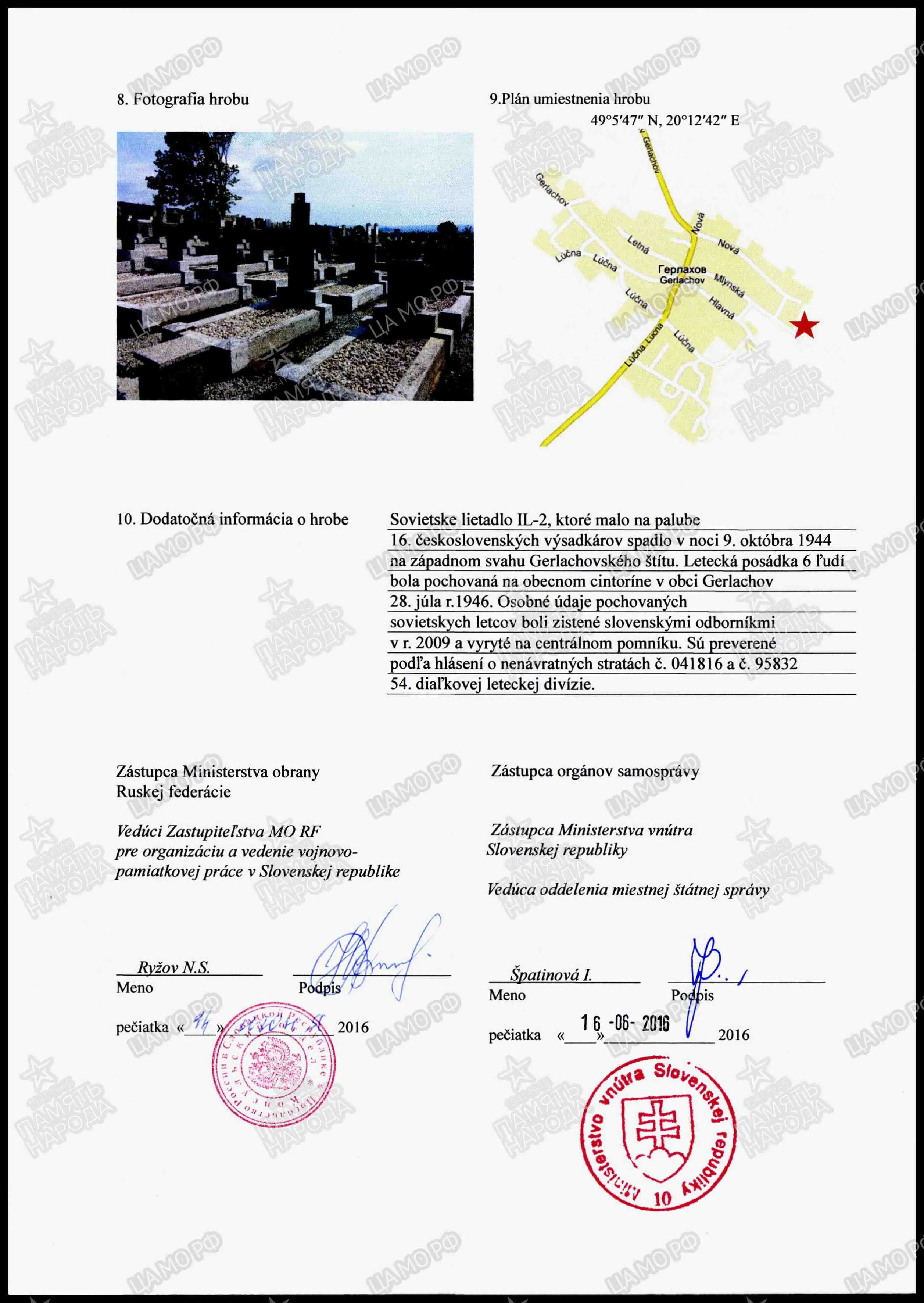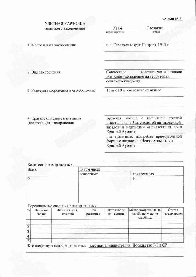 Страна захоронения Словакия Регион захоронения н.п. Герлахов (округ Попрад) Номер захоронения в ВМЦ З421-20 Дата создания современного места захоронения __.__.1945 Дата последнего захоронения __.__.1945 Вид захоронения братская могила Состояние захоронения отличное Количество могил 1 Захоронено всего 9 Захоронено известных 0 Захоронено неизвестных 9 Кто шефствует над захоронением местная администрация; посольство РФ в СР https://obd-memorial.ru/html/info.htm?id=262038871&p=1