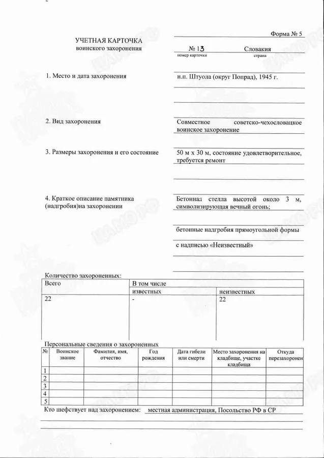 Страна захоронения Словакия Регион захоронения н.п. Штуола (округ Попрад) Номер захоронения в ВМЦ З421-67 Дата создания современного места захоронения __.__.1945 Дата последнего захоронения __.__.1945 Состояние захоронения удовлетворительное Захоронено всего 22 Захоронено известных 0 Захоронено неизвестных 22 Кто шефствует над захоронением местная администрация; посольство РФ в СР https://obd-memorial.ru/html/info.htm?id=262038868