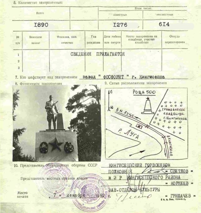 Первичное место захоронения Ленинградская обл., Кингисеппский р-н, г. Кингисепп, северная окраина главного кладбища