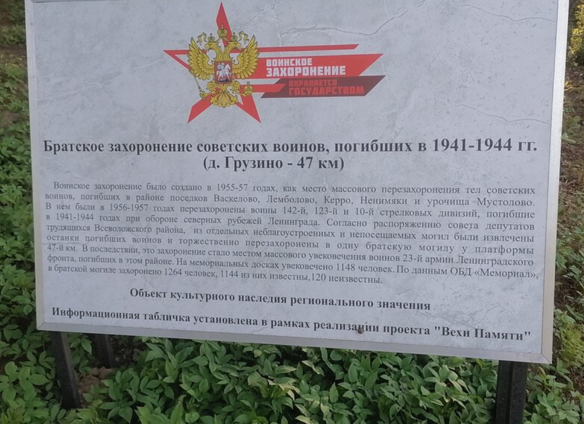 | Авиации СГВ МЕМОРИАЛЫ И ЗАХОРОНЕНИЯ СОВЕТСКИХ ВОИНОВ ВОИНСКИЕ ЗАХОРОНЕНИЯ В РОССИИ Ленинградская обл., Россия Захоронение Гарболово (Всеволжский р-он) (Всеволжский район) |