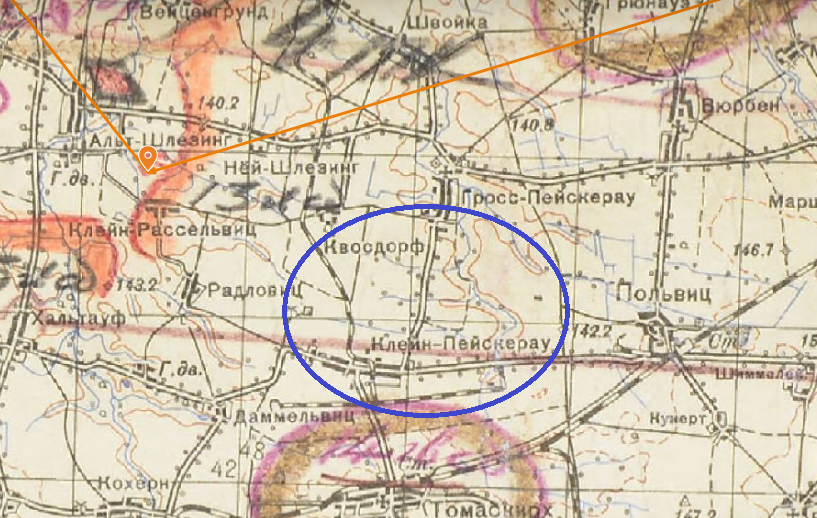 Нет там проблем. Две деревни хоронили на одном кладбище. Разницы нет по какой деревне писать адрес кладбища. Можно указывать и Квосдорф и Клейн-Пейскерау