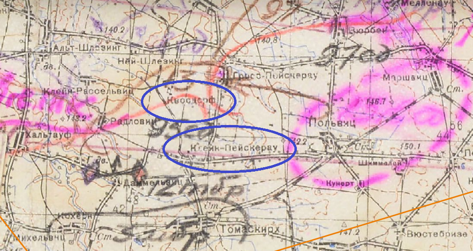 Здравствуйте!Мой дед:Корень Михаил Артемович(Артемьевич)1918г.р.,гв.сержант 39гсп,13гсд.ПО донесениям 39гсп погиб 09.02.45г в районе Кляйн-Пейскурау(Пискорцовек) и захоронен на северной окраине Квосдорф(Хвастница).На схеме полка захоронение есть и на востчной окраине Квосдорфа.Известно ли что нибудь о судьбе этих захоронений?Буду очень благодарен Вам за любую информацию.