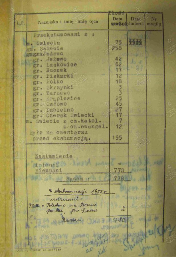 | Информация из списков захоронения Фамилия [42 неизвестных] Имя Отчество Последнее место службы 0 Страна захоронения Польша Регион захоронения Быдгощское воев. Место захоронения повят Свецкий, Свеце, по ул. Красной Армии Откуда перезахоронен гм. Свеце, гр. Ежево