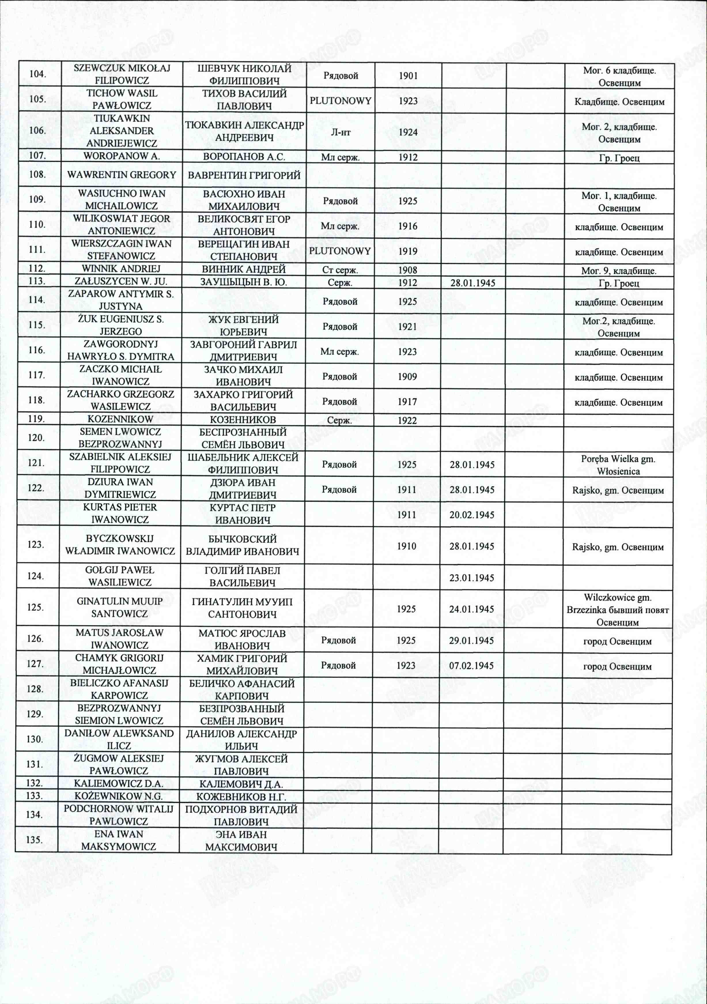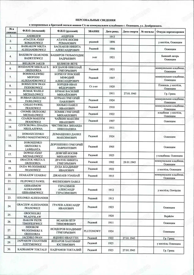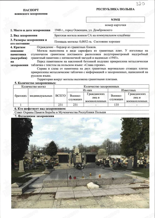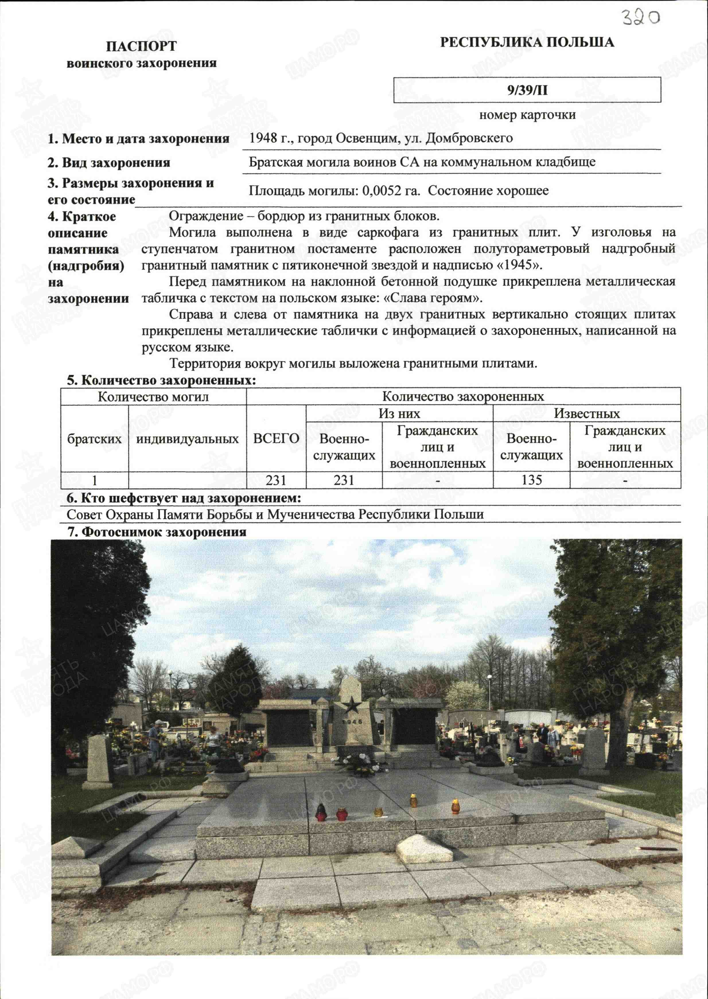 Страна захоронения Польша Регион захоронения Малопольское воев. Номер захоронения в ВМЦ З48-320 Место захоронения г. Освенцим, ул. Домбровскего Дата создания современного места захоронения __.__.1948 Дата последнего захоронения __.__.1948 Вид захоронения братская могила воинов СА на коммунальном кладбище Состояние захоронения хорошее Количество могил 1 Захоронено всего 231 Захоронено известных 135 Захоронено неизвестных 96 Кто шефствует над захоронением Совет Охраны Памяти Борьбы и Мученичества Республики Польши Откуда производились перезахоронения Буякув; г. Освенцим; гм. Влосеница, Поремба Велька; гм. Освенцим, Райско; гр. Гроец; Медзыбродзе Бельске; Мендзыбродзе Бельске; повят Освенцим (быв.), гм. Бжезинка, Вильчковице; Полянка Велька; Поромбка