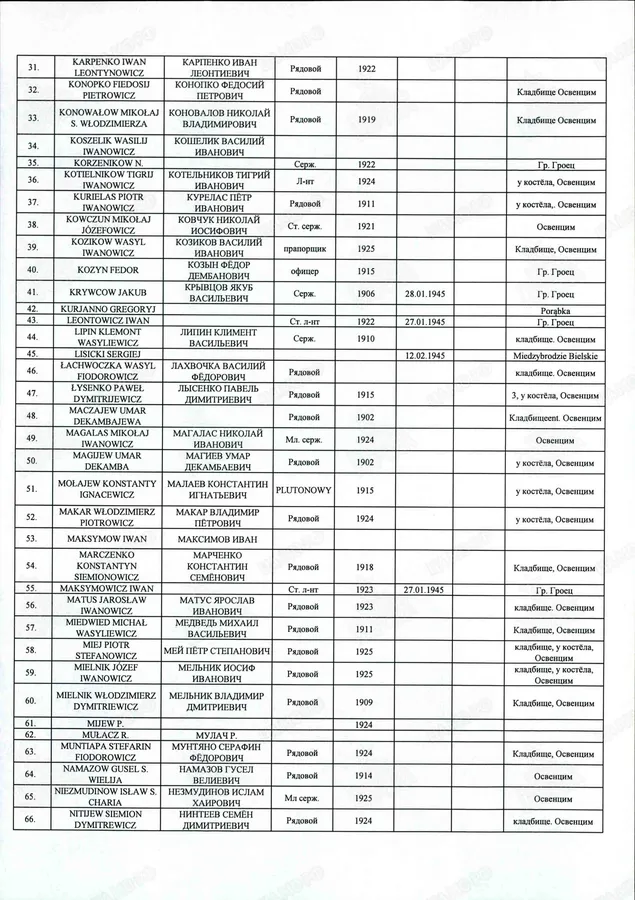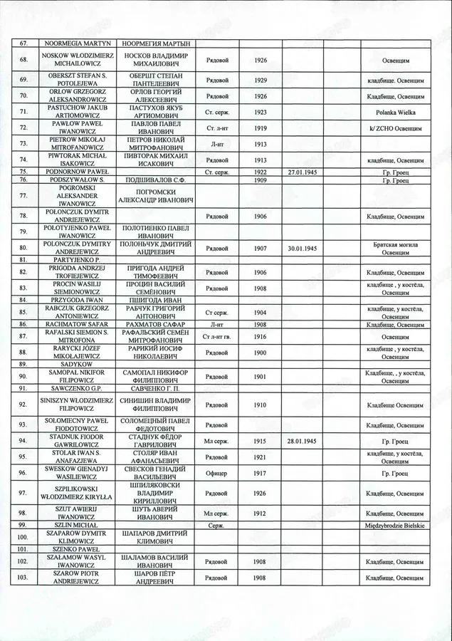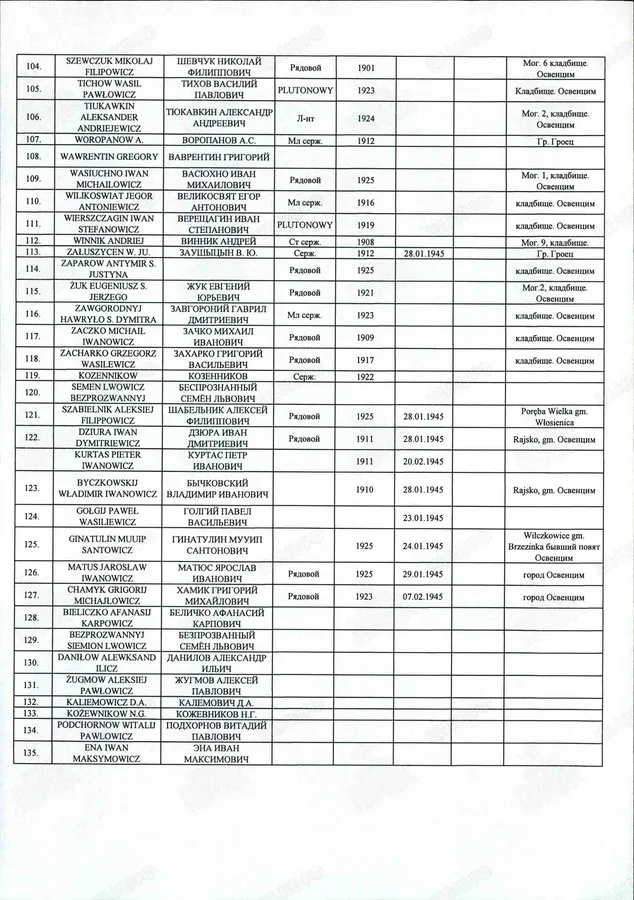 Перезахоронение на мемориал Освенцим... Фамилия Бумак Имя Василий Отчество Михайлович Дата рождения/Возраст __.__.1911 Дата смерти 27.01.1945 Страна захоронения Польша Регион захоронения Малопольское воев. Место захоронения г. Освенцим, ул. Домбровскего Откуда перезахоронен гр. Гроец https://www.obd-memorial.ru/html/info.htm?id=86109711